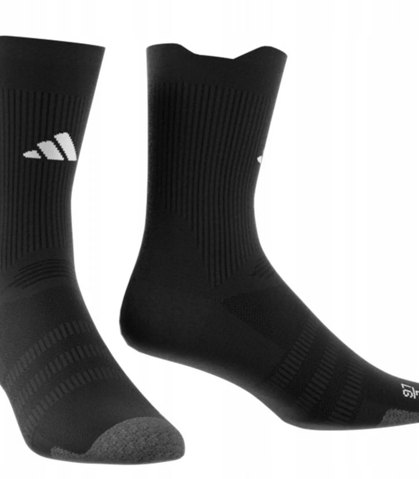 Adidas Logo–Zwarte Sokken bestaan uit 56% gerecycled polyester en 41% gerecycled polyamide, met daarnaast 3% elastaan. Het ontwerp is opvallend door het gebruik van contrastende kleuren en de aanwezigheid van het Adidas logo. Deze sokken maken gebruik van de Heat.Rdy–technologie, waardoor ze snel droog en warm zijn. De trekkoord en gladde naden garanderen een comfortabele fit. Het model is een middenkuit.