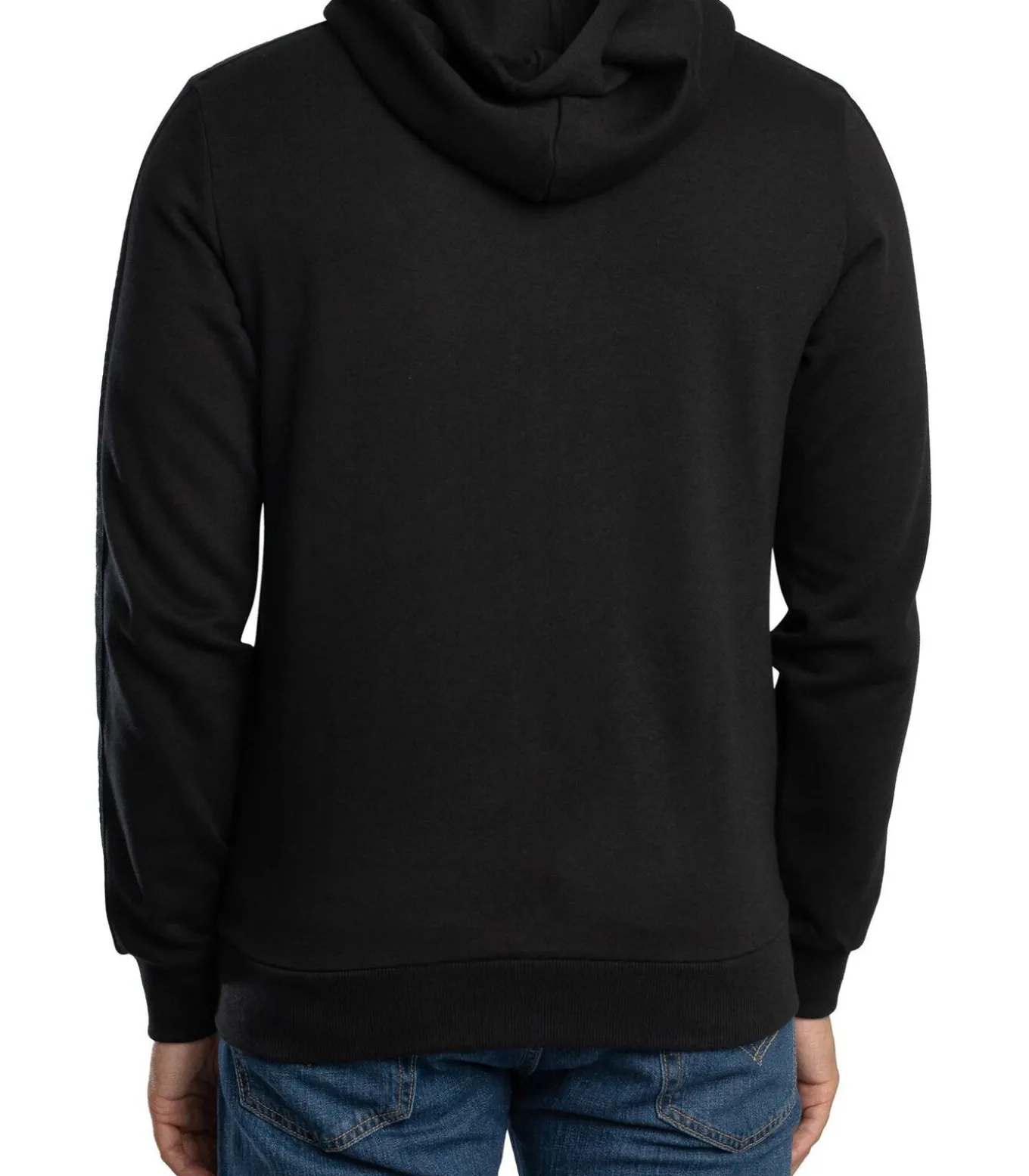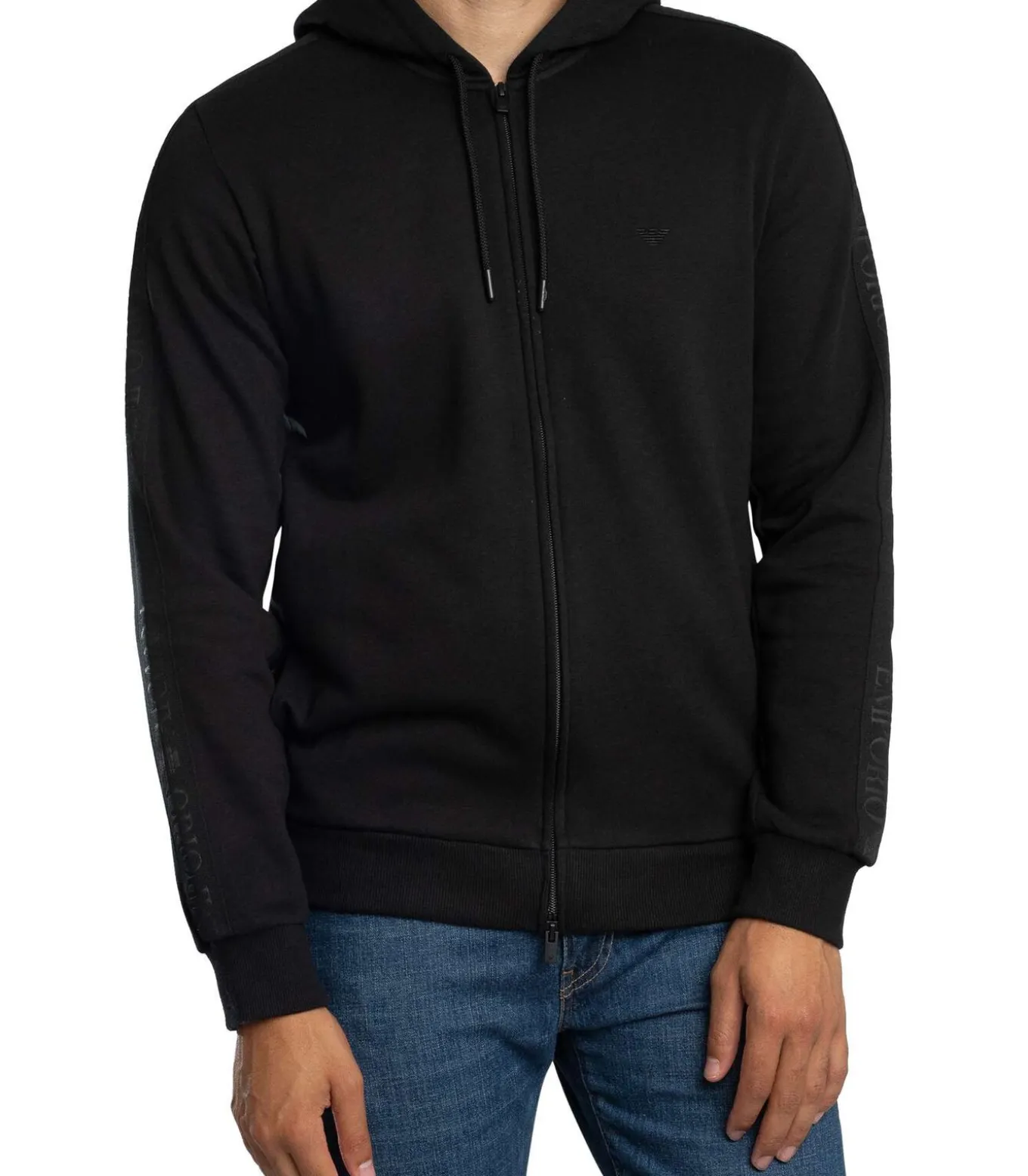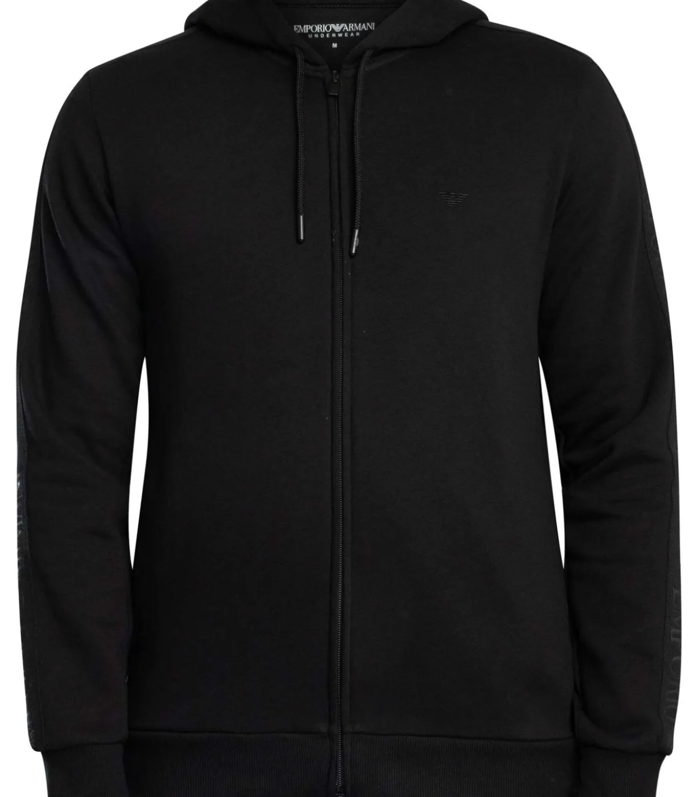De Emporio Armani Lounge Felpa Zip Hoodie in zwart combineert premium comfort met een strak, modern design. Het geborduurde logo voegt een kenmerkende branding toe aan de borst, terwijl de branding op de mouwen de algehele esthetiek versterkt. Elastische manchetten en zoom zorgen voor een nauwsluitende, veilige pasvorm, terwijl de capuchon met trekkoord zorgt voor een verstelbare bedekking. Open zakken bieden praktische opbergruimte, waardoor deze hoodie ideaal is voor casual gebruik of als laagjes.