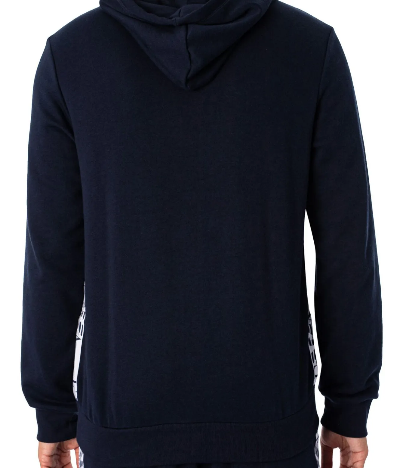 De Lounge Chest Logo Zip Hoodie van Emporio Armani wordt geleverd met open zakken en een capuchon met trekkoord, met elastische manchetten en zoom. Deze hoodie komt uit de loungewear serie. Deze hoodie is uitgevoerd in de kleur Marine en heeft een logo op de borst en een merkpatroon op de zijkanten.