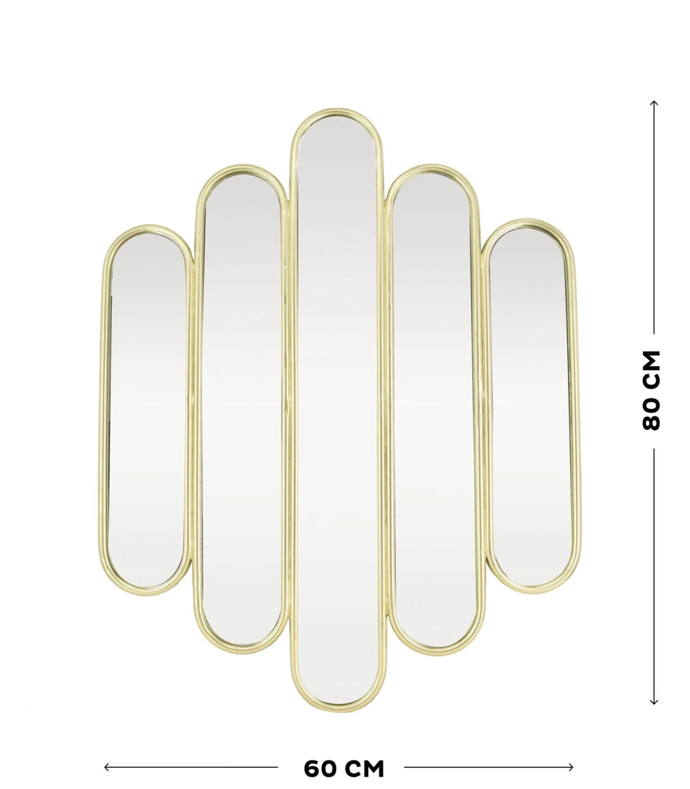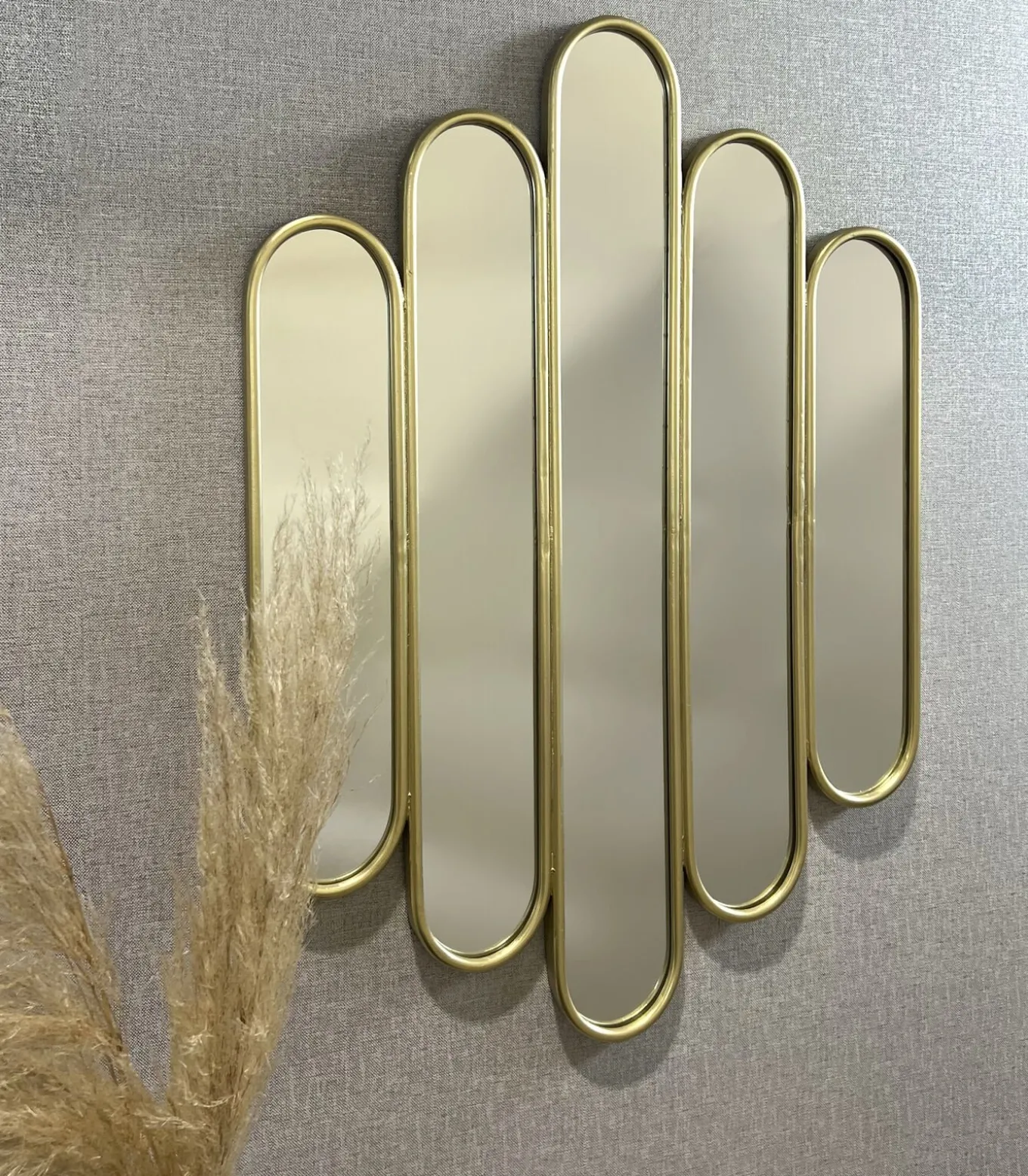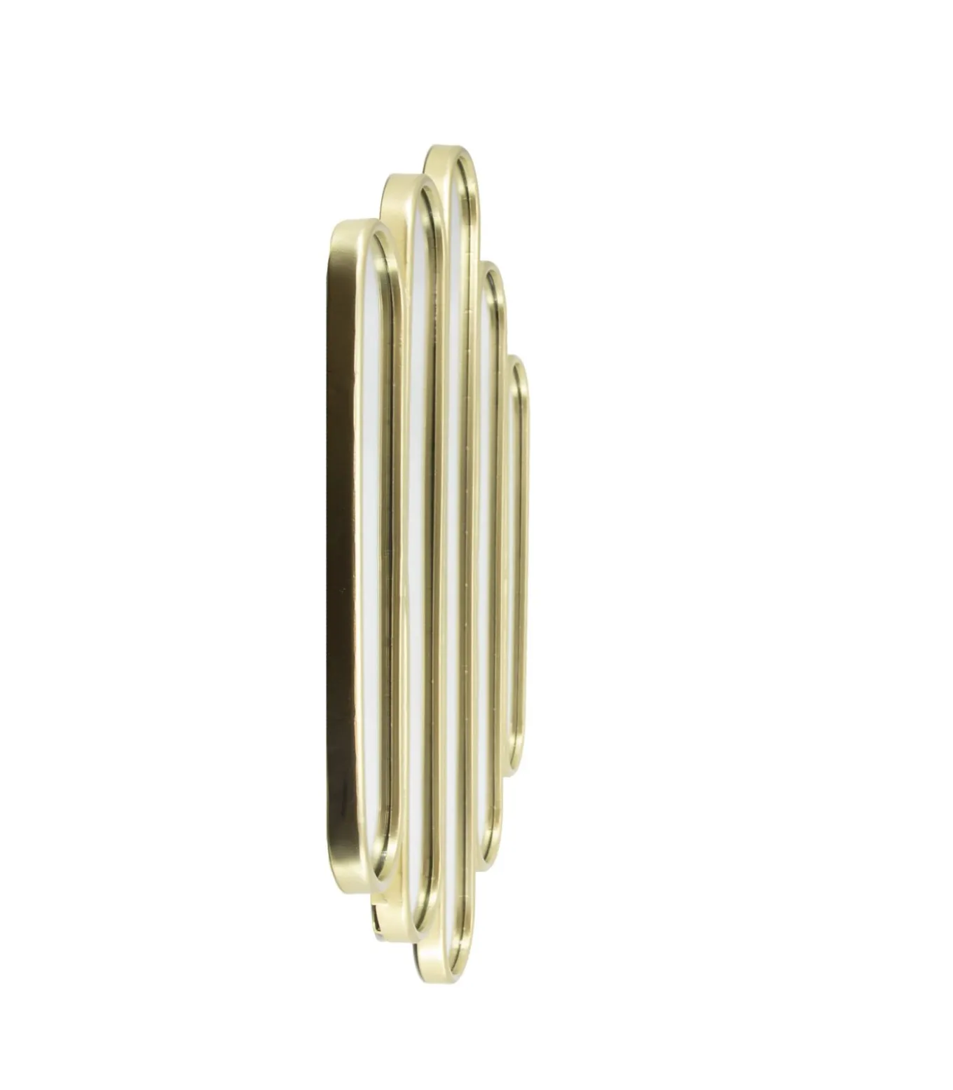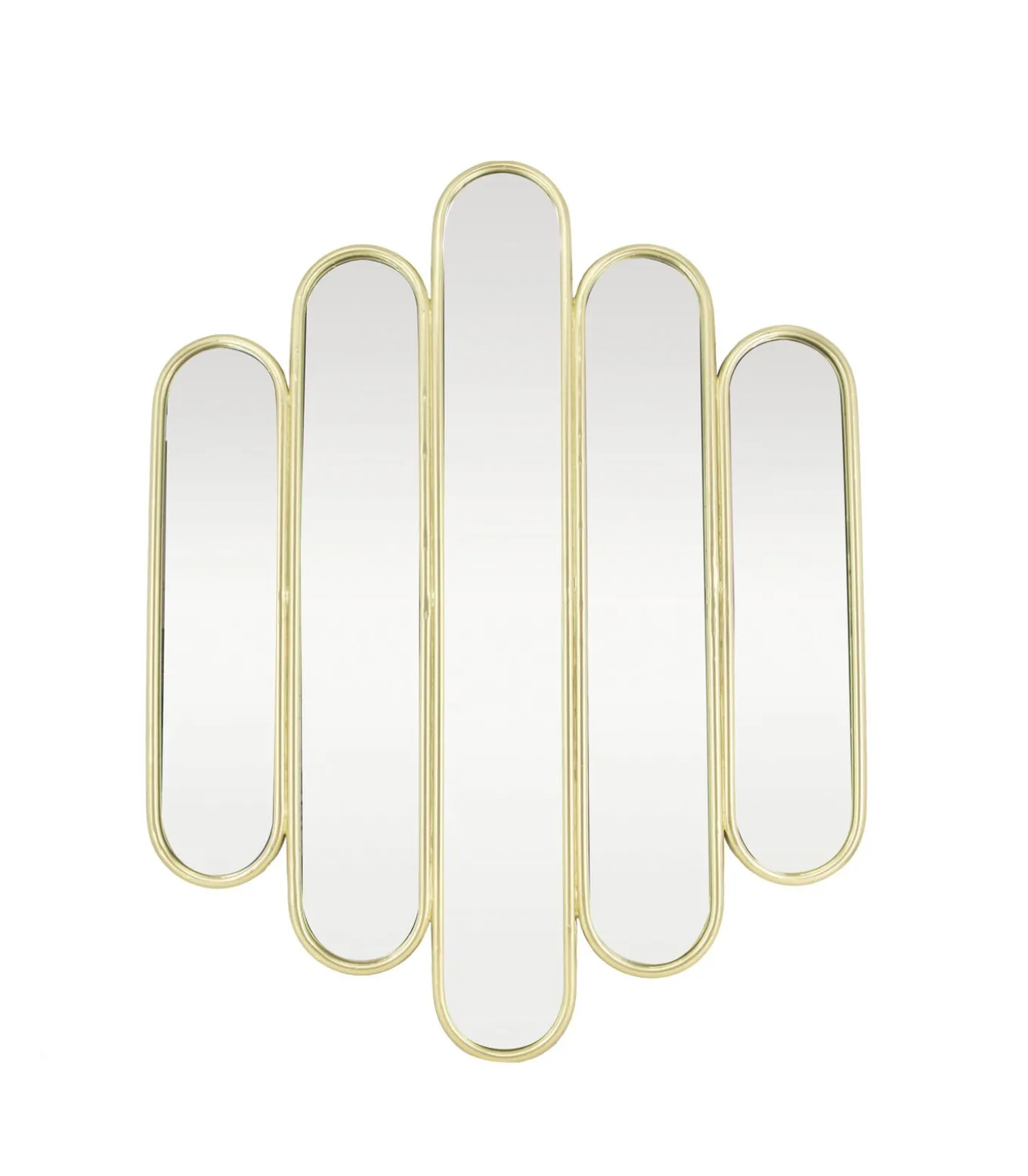 Een elegante spiegel van glas en een metalen, gouden omlijsting met boogvormen.