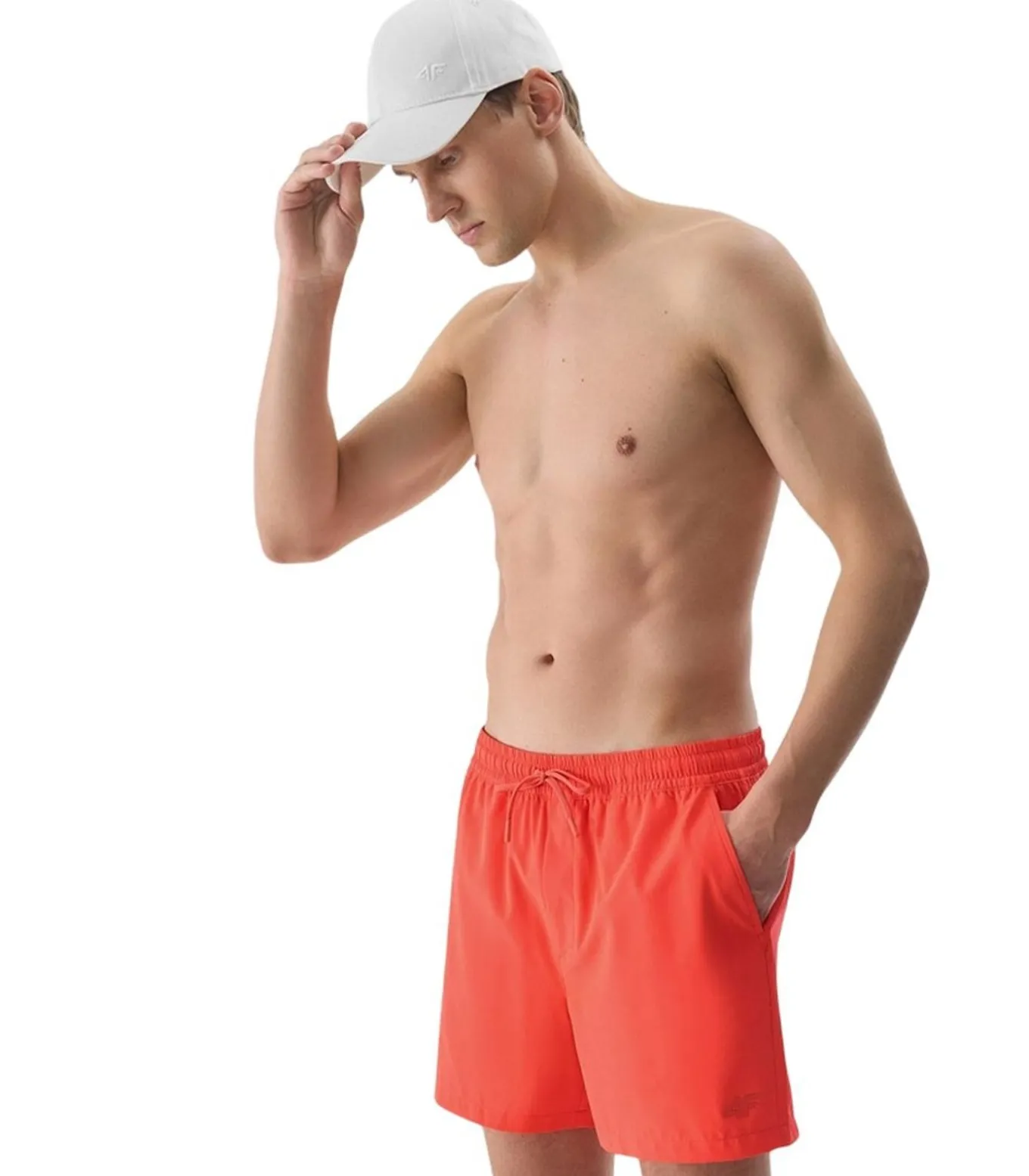 Zwembroek 4F M085 met een aangrijpend oranje uiterlijk is gemaakt van stevig polyester materiaal. Dit eenvoudige ontwerp heeft twee zijzakken en wordt vastgemaakt door een trek aan de achterkant. De tailleband is vervaardigd uit elastisch koord voor een goed passend gevoel.