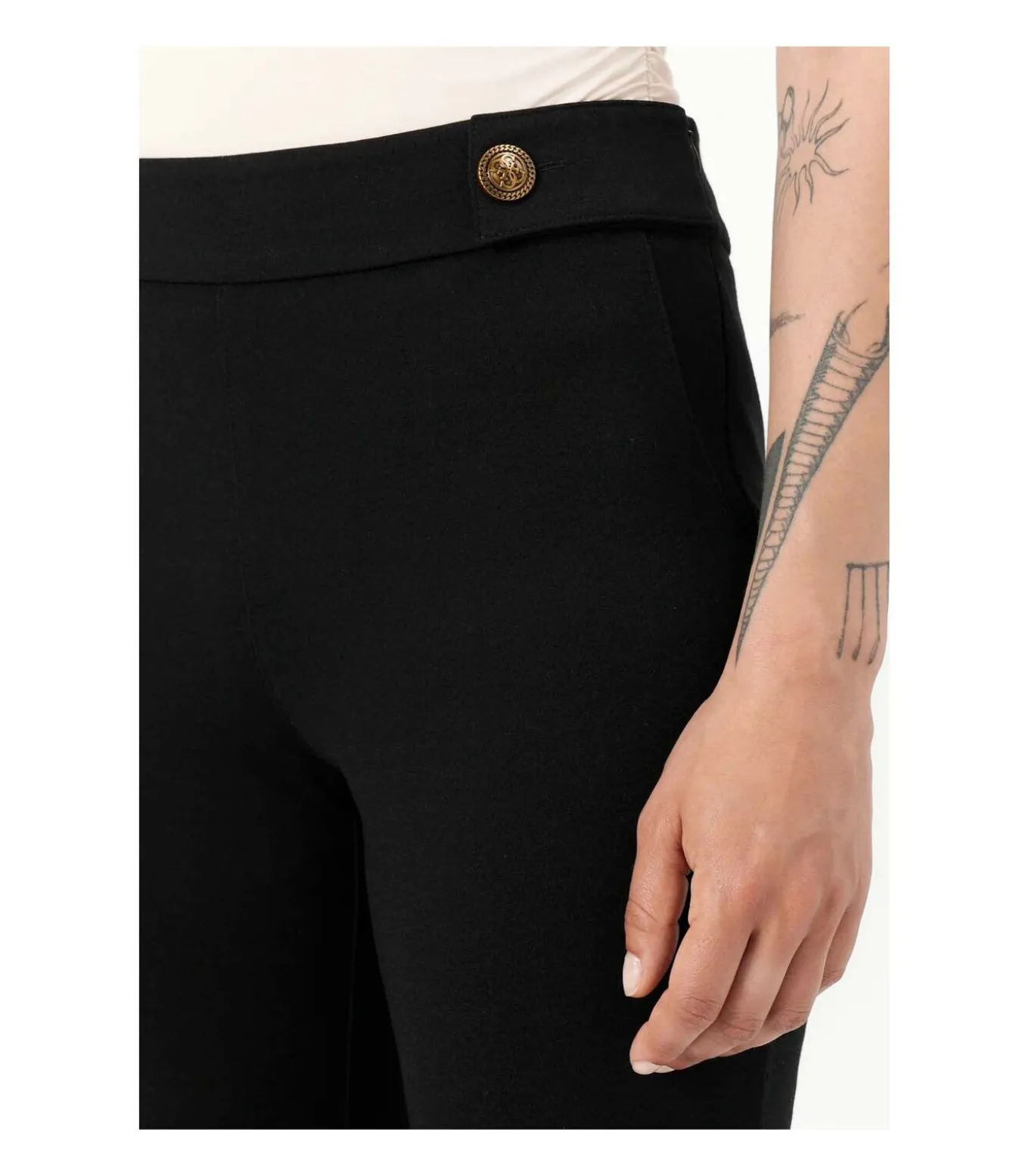 Kleur: Jet Black Samenstelling: 65% Viscose, 31% Polyamide, 4% Elastaan Pasvorm: Wijd uitlopend Sluiting: Decoratieve knopen in de taille Details: Hoge taille met metalen knopen, uitlopende lijn aan de onderkant Gebruik: Perfect voor het accentueren van het silhouet, ideaal om te combineren met shirts of topjes voor een elegante en vrouwelijke look.