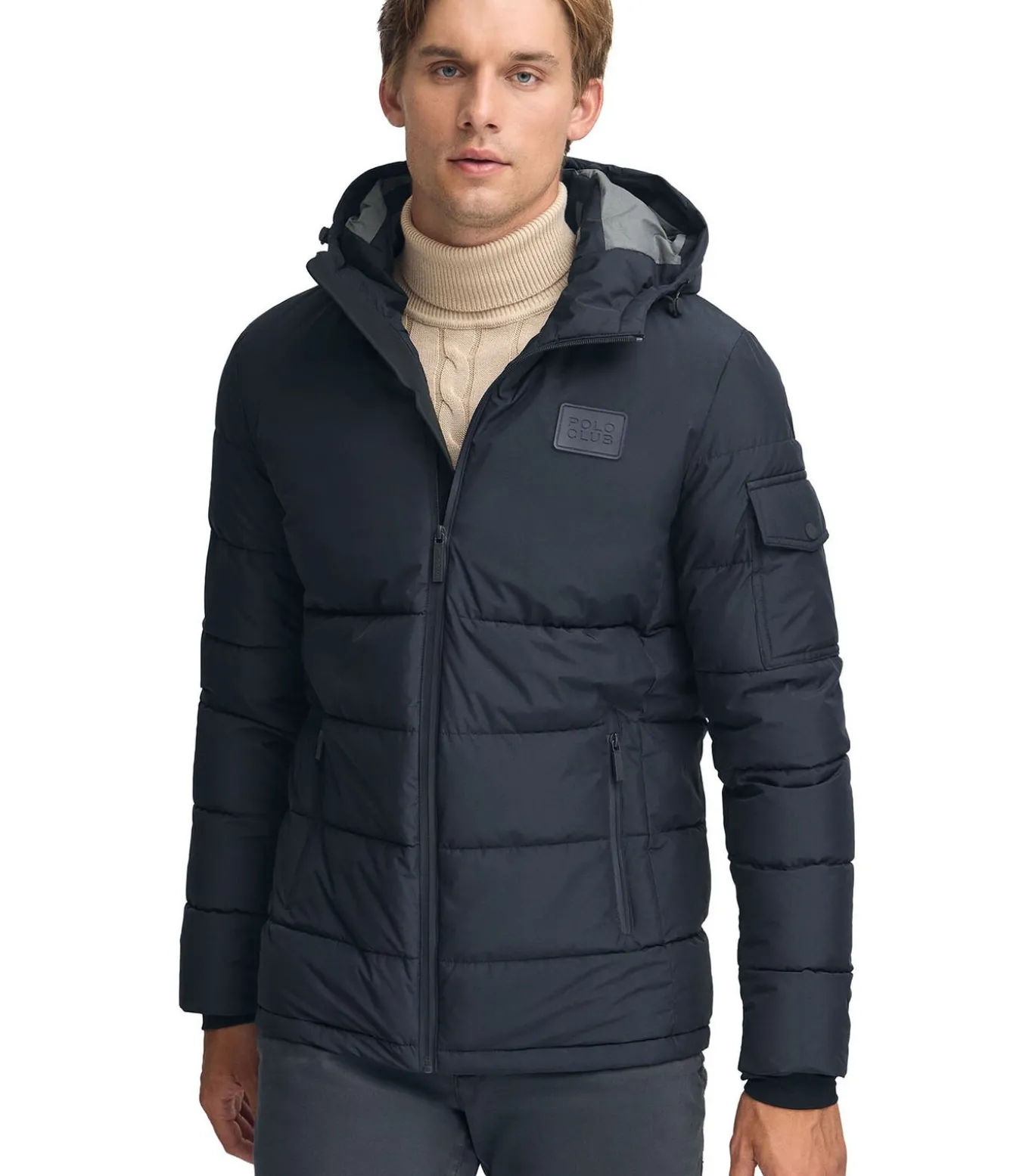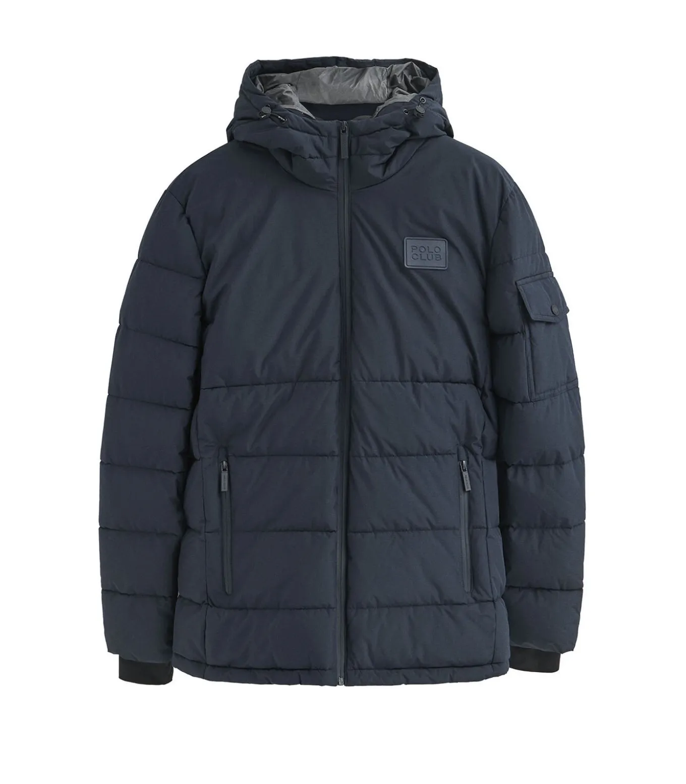 Gewatteerde herenjas met capuchon, regular fit en opstaande kraag met ritssluiting. Met meerdere zakken zowel binnen al buiten, zelfs ééntje op de mouw met een knoopsluiting. De capuchon heeft verstelkoorden en aan de binnenkant zitten schouderbanden zodat je ‘m ook op je rug kunt dragen. Gemaakt van waterbestendige stof, dus helemaal klaar voor koud en nat weer.