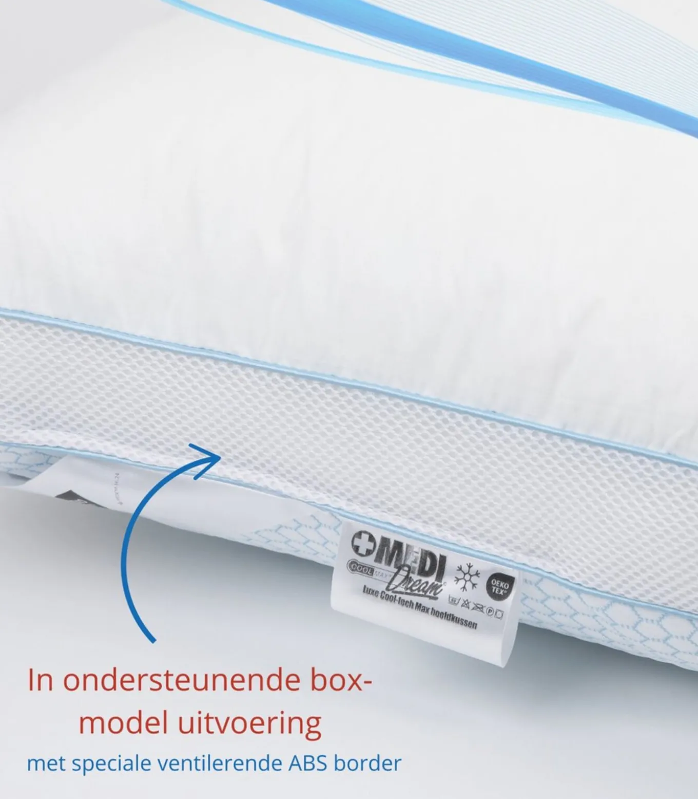 In het midden voorzien van extra ventilerende ABS Border randen. Zij zorgen voor een opstaande rand in het hoofdkussen, waardoor er meer ondersteuning gericht wordt naar de schouders én nek.