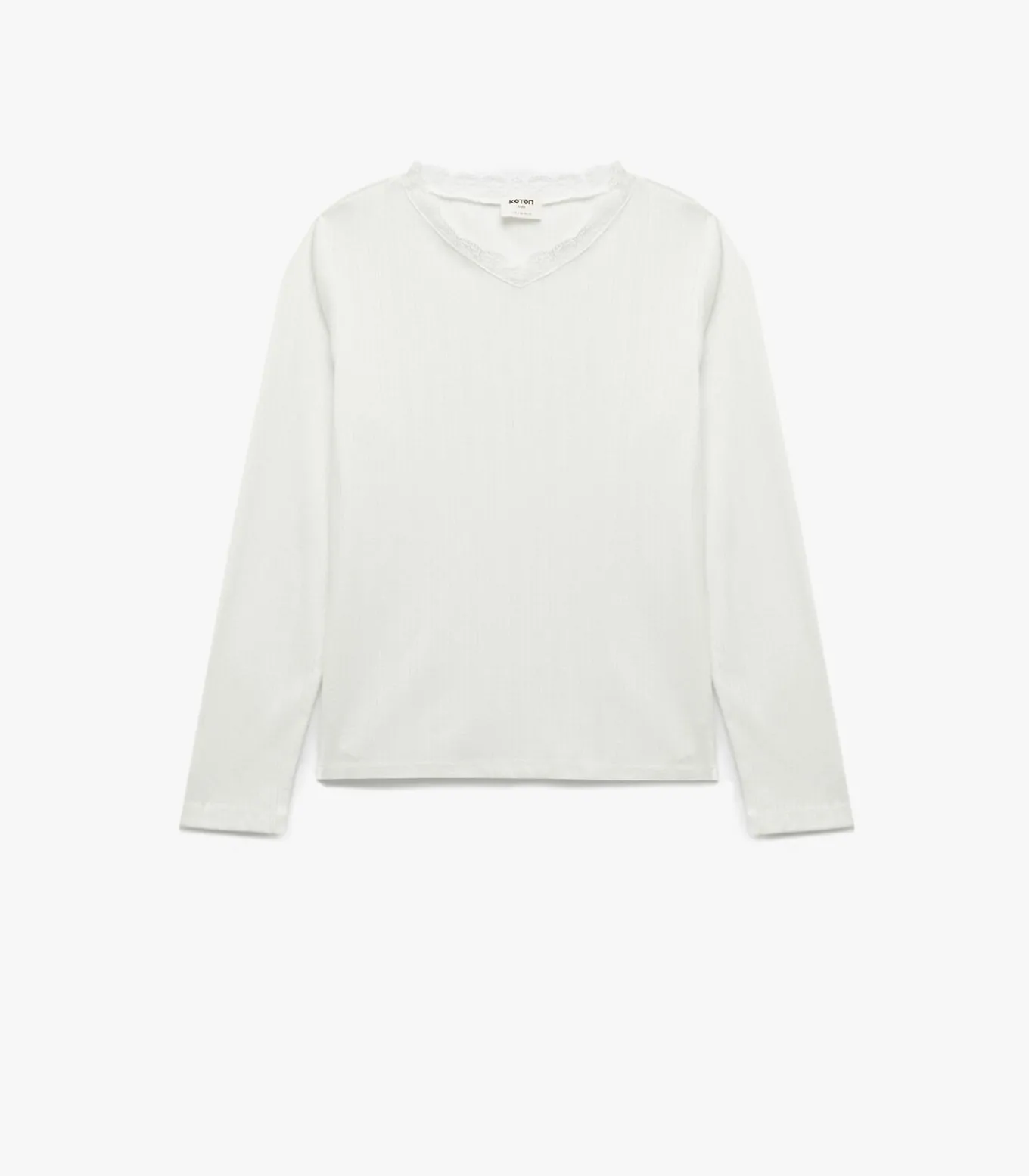 Dit elegante meisjes T–shirt combineert comfort en stijl met zijn subtiele kanten details rond de V–hals. Ideaal voor dagelijks gebruik, dankzij de zachte katoenen stof die de hele dag draagcomfort biedt. De lange mouwen maken het perfect voor alle seizoenen, en het past moeiteloos bij elke outfit in de garderobe van je kind.