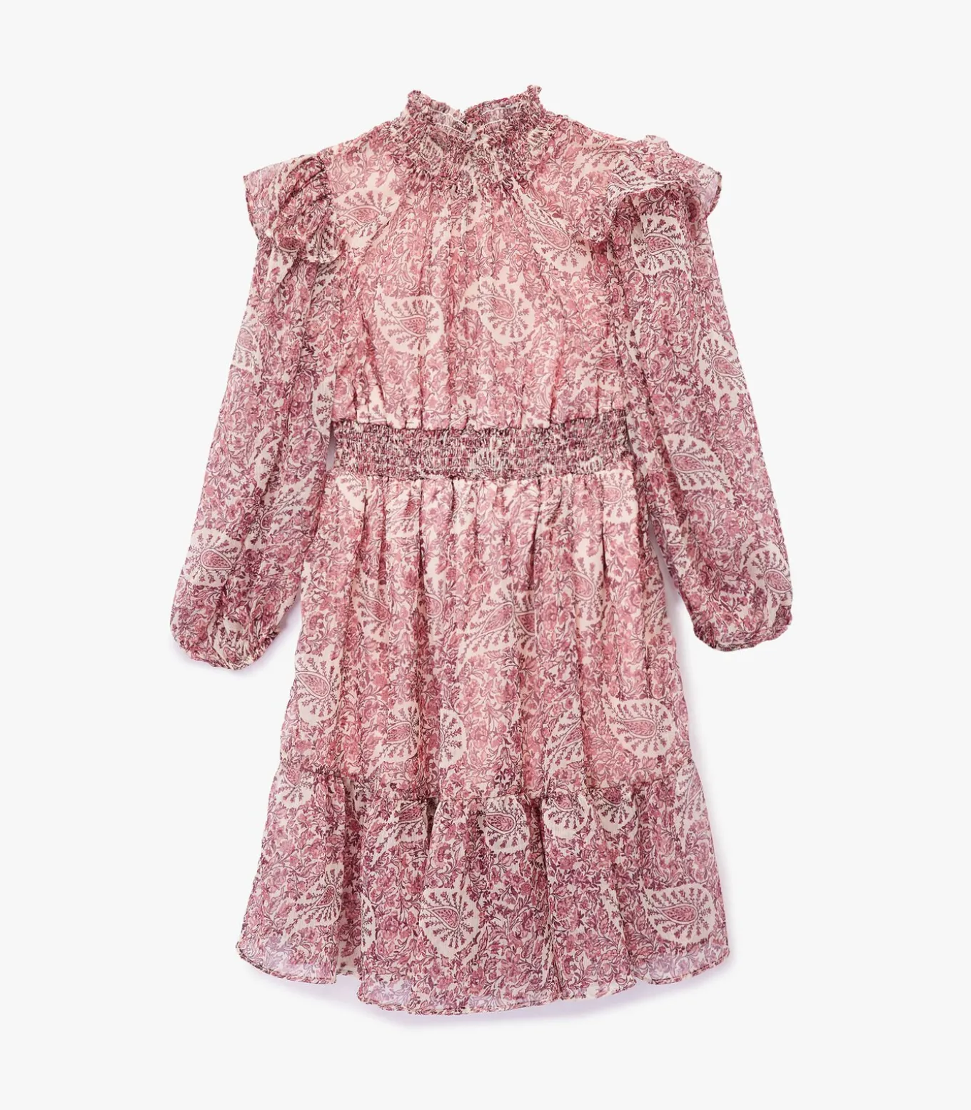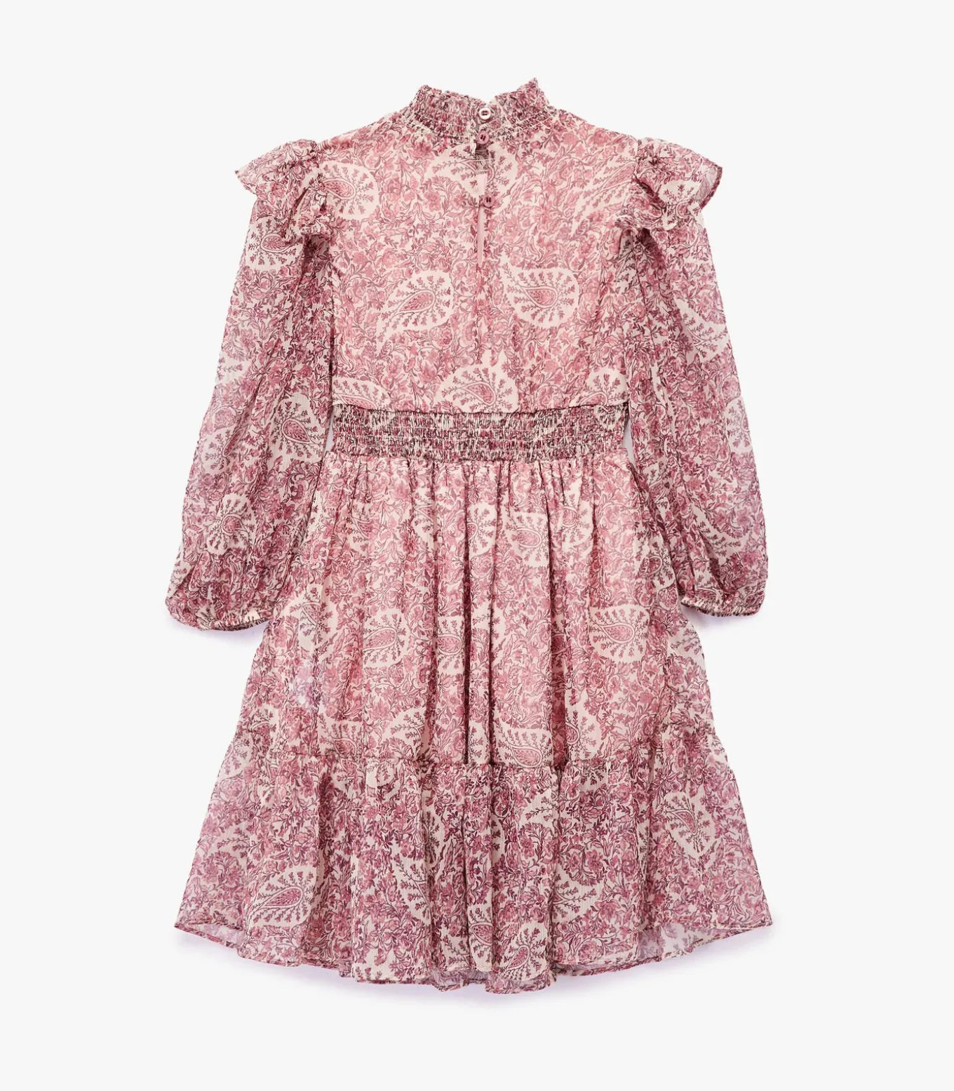 Deze chique meisjesjurk biedt een elegante uitstraling dankzij de lange mouwen en opstaande kraag. Het schitterende patroon geeft een speelse twist, terwijl de volants en gesmokt detail in de taille voor een verfijnde afwerking zorgen. Ideaal voor zowel dagelijks gebruik als speciale gelegenheden, deze jurk combineert stijl en comfort moeiteloos.