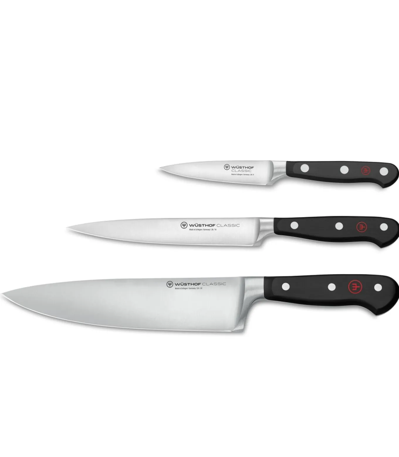 Ben je toe aan een nieuwe set messen maar weet je niet welke messen geschikt zijn? Deze Wusthof messenset uit de Classic serie is de startset voor elke kok. De set bestaat uit:Wusthof Koksmes Classic 20 cmWusthof Vleesmes Classic 16 cmWusthof Officemes Classic 9 cmHet koksmes is geschikt om grote hoeveelheden in snelle tijd weg te snijden. Het vleesmes gebruik je om al het vlees netjes te proportioneren. Voor alle kleinere snijtaken is het officemes de perfecte keuze.