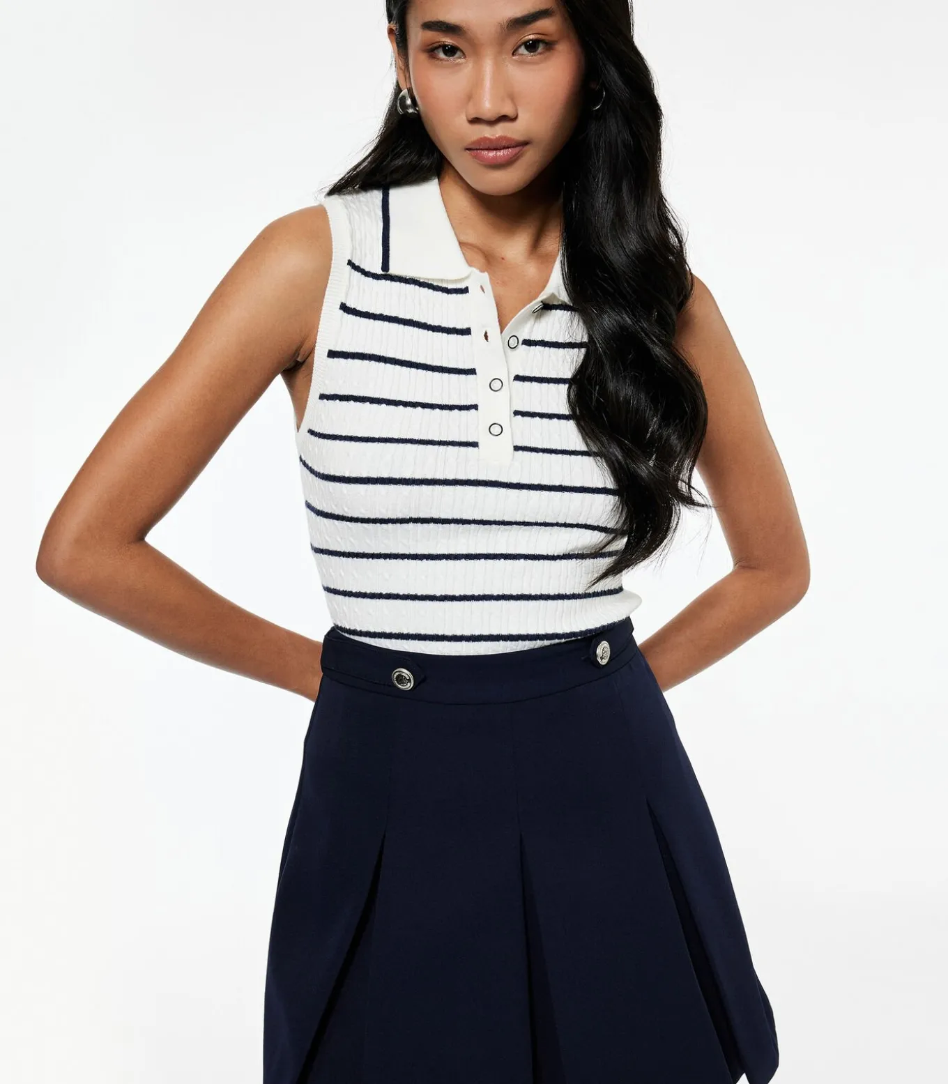 Voeg een verfijnde twist toe aan je dagelijkse garderobe met deze elegante mouwloze polo trui. De blouson heeft een klassieke kraag en een tijdloos streeppatroon dat moderniteit en stijl uitstraalt. De knoopsluiting voegt een verfijnd detail toe, terwijl de zachte trui zorgt voor comfort de hele dag door. Ideaal om te combineren met een spijkerbroek voor een casual uitstraling of met een midi–rok voor een chique look. Perfect voor zowel kantoor als vrije tijd, dit veelzijdige kledingstuk wordt ongetwijfeld een favoriet in je kledingkast.