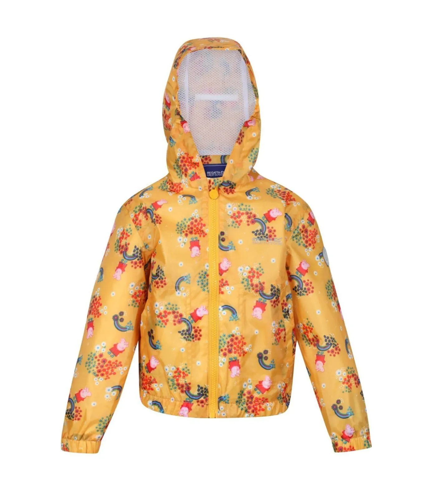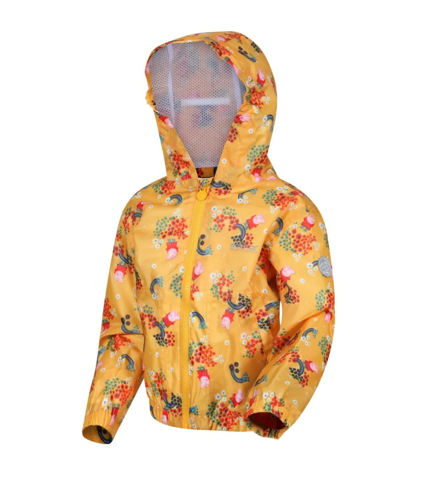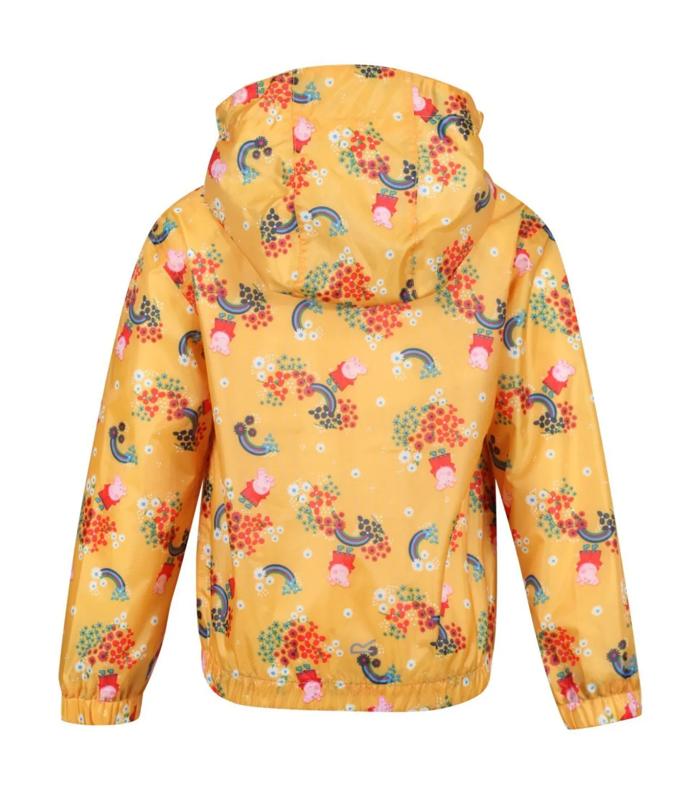 Deze jas is ontworpen voor kinderen en heeft Peppa Pig–figuren. Het is gemaakt van 100% polyester stof met een Hydrafort voering voor bescherming tegen water. Het materiaal en de constructie zorgen voor een waterdichte afwerking. Belangrijke details zijn een elastische capuchon met naamlabel, twee zakken aan de onderkant, een volledige ritssluiting en elastische manchetten en zoom voor een goede pasvorm. Deze jas heeft een officiële licentie en is geschikt voor buitenspelen op regenachtige dagen met zijn bloemenprint waarop Peppa Pig staat afgebeeld.