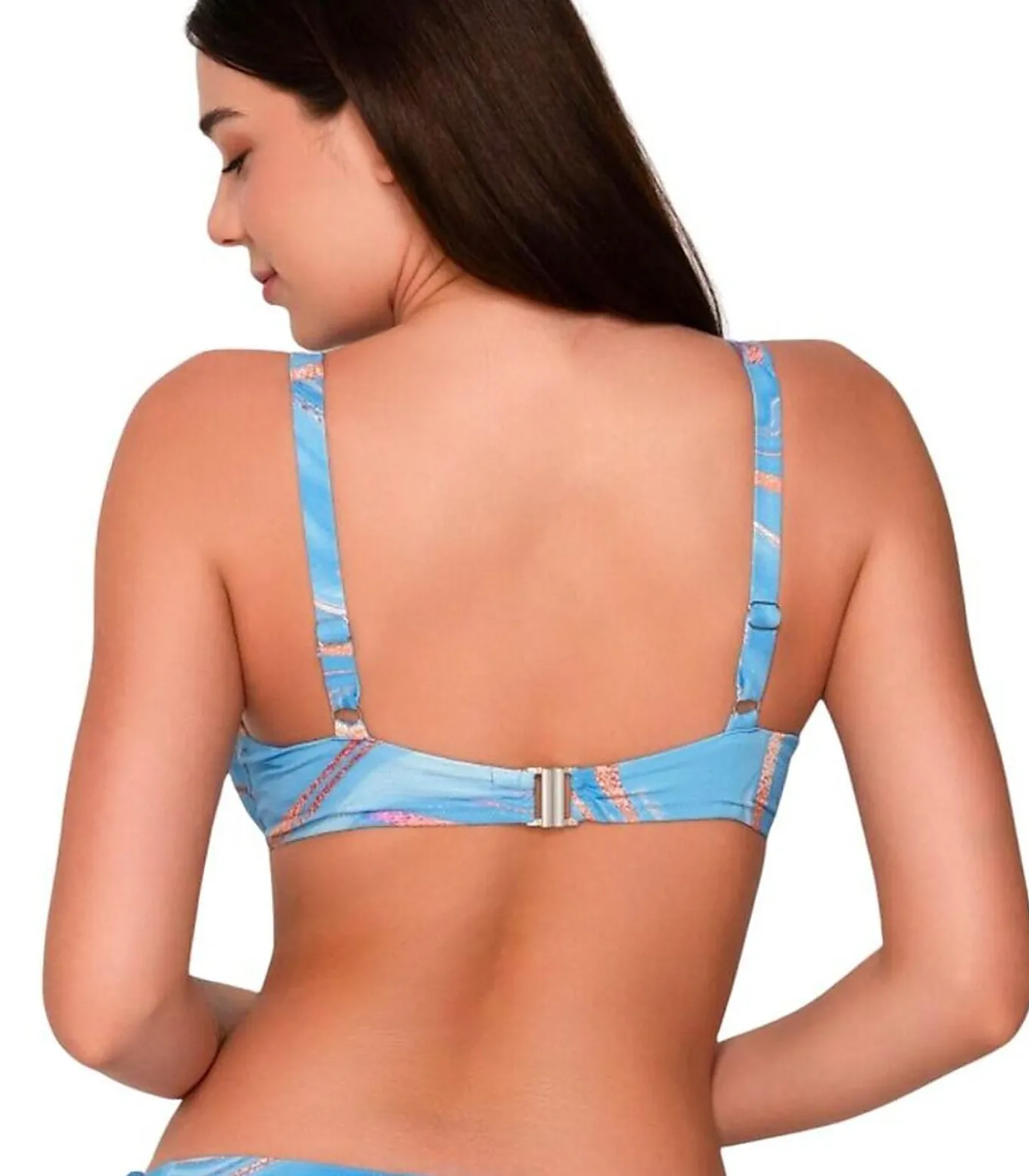 Deze zwemshort is een balconnetmodel met niet–voorgevormde cups en biedt een goede natuurlijke ondersteuning. Licht in elkaar grijpende vorm, met een zachte V–vormige snit die de lijn van de buste volgt. De chique, elegante blauwe golfprint met geborduurde lurexdetails geeft een luxueus speciaal effect met een frisse, artistieke touch. Het heeft een dun bandje dat rond de hals wordt geknoopt en aan de voorkant is versierd met een juweel dat doet denken aan een schelp, wat een elegante, vrouwelijke dimensie toevoegt. Ideaal voor een chique, kleurrijke strandlook. De dunne bandjes zijn verstelbaar voor een perfecte pasvorm. Ze zijn ook bedrukt, zodat het patroon harmonieus doorloopt op de schouders. Klipsluiting op de rug.[Badpak topje apart verkrijgbaar. Topje en zwembroekje worden apart verkocht. Het zwembroekje, de sieraden en andere accessoires die het model op de foto’s draagt, zijn niet inbegrepen].