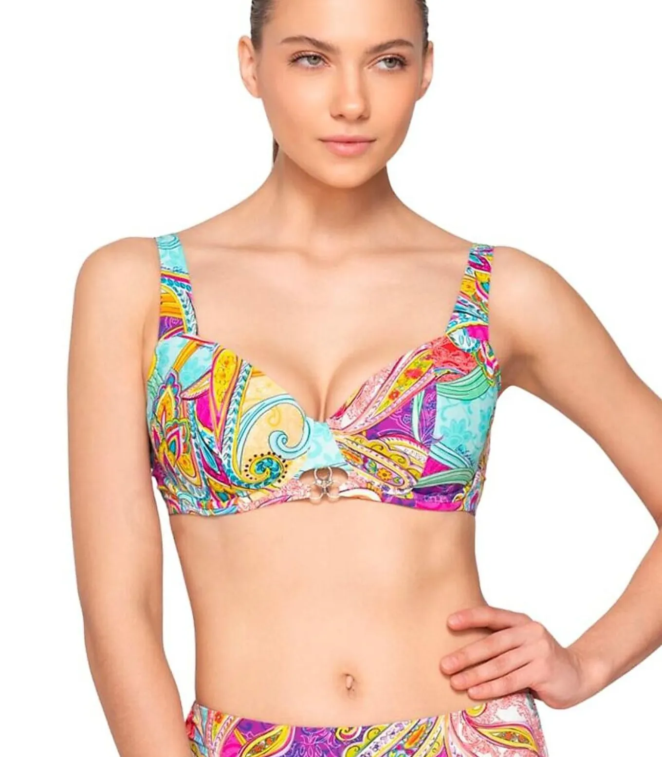 Balconnetzwemshort met niet–voorgevormde cups, die een goede natuurlijke ondersteuning bieden. Licht in elkaar grijpende vorm, met een zachte V–vormige snit die de bustelijn volgt. Het levendige, gedetailleerde patroon is perfect voor vakantie of een levendige strandlook. Het combineert arabesken, op paisley geïnspireerde swirls, bloemvormen en spiraalelementen in een helder kleurenpalet. De combinatie roept een bohemien, zomers gevoel op, met een chique psychedelisch tintje, voor wie van originele, kleurrijke badmode houdt en toch goede ondersteuning wil. De dunne bandjes zijn verstelbaar voor een perfecte pasvorm. Ze zijn ook bedrukt, zodat het patroon harmonieus doorloopt op de schouders. Kleine decoratieve juwelen tussen de cups. Zachte polyamide stof biedt duurzaamheid en elasticiteit voor maximaal comfort. Klipsluiting op de rug.[Badpak topje apart verkrijgbaar. Topje en zwembroekje worden apart verkocht. Het zwembroekje, de sieraden en andere accessoires die het model op de foto’s draagt, zijn niet inbegrepen].