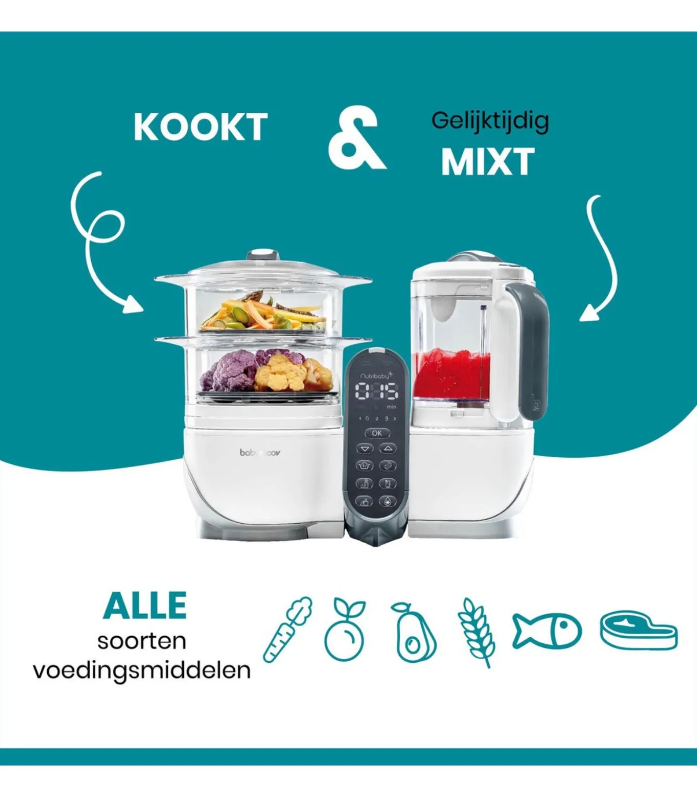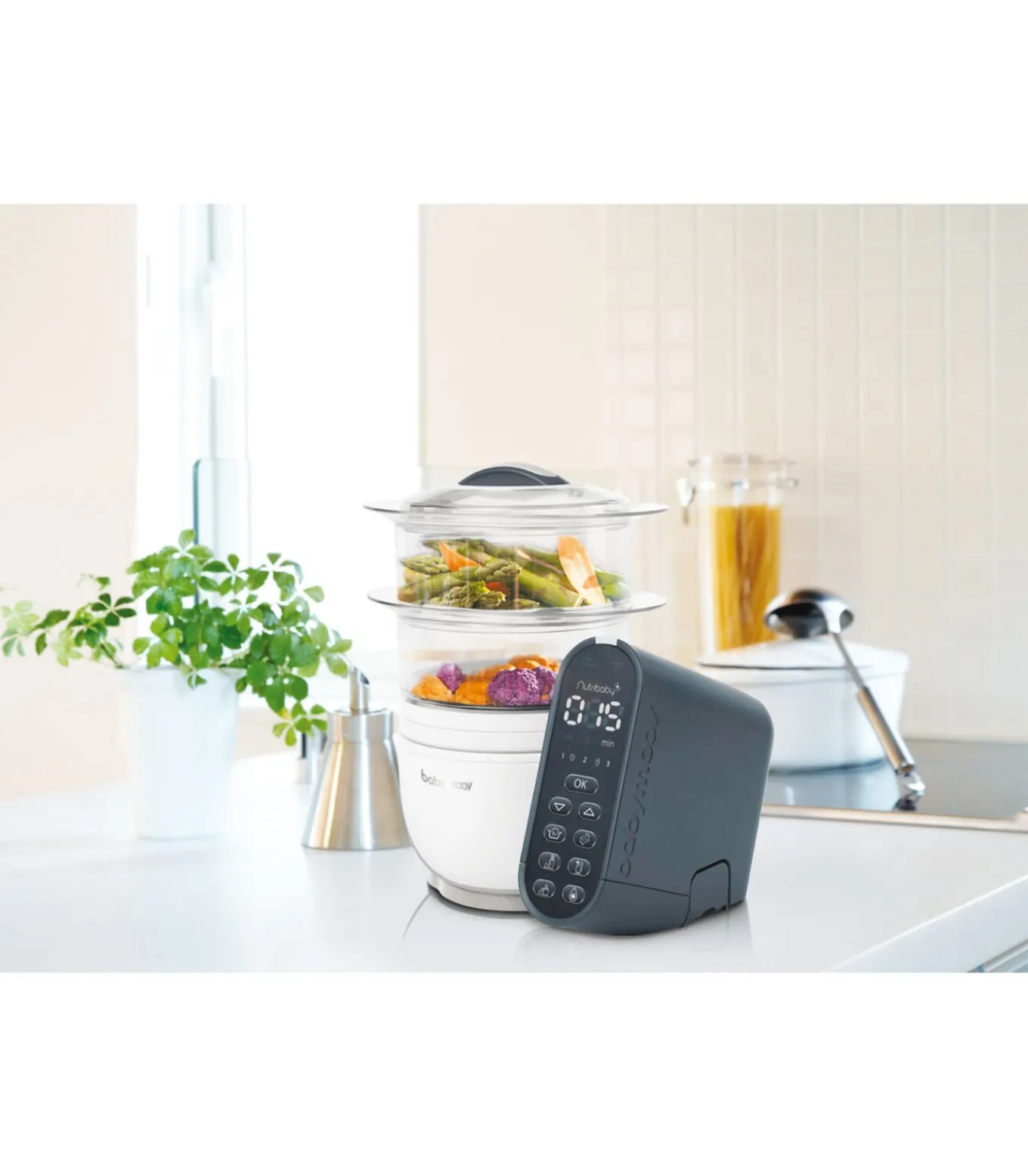 6 in 1 (voorgeprogrammeerde functies): stomen, mixen, ontdooien, steriliseren en flessenwarmer en pannenwarmer 2 manden om voedsel afzonderlijk te koken: behoudt vitamines en smaken Grote kookcapaciteit: bereid meer dan 10 maaltijden in één keer Gemakkelijk te gebruiken met zijn zes programma’s, alarmen, timer en automatische uitschakeling GRATIS: 3 babybols + 2 babylepels