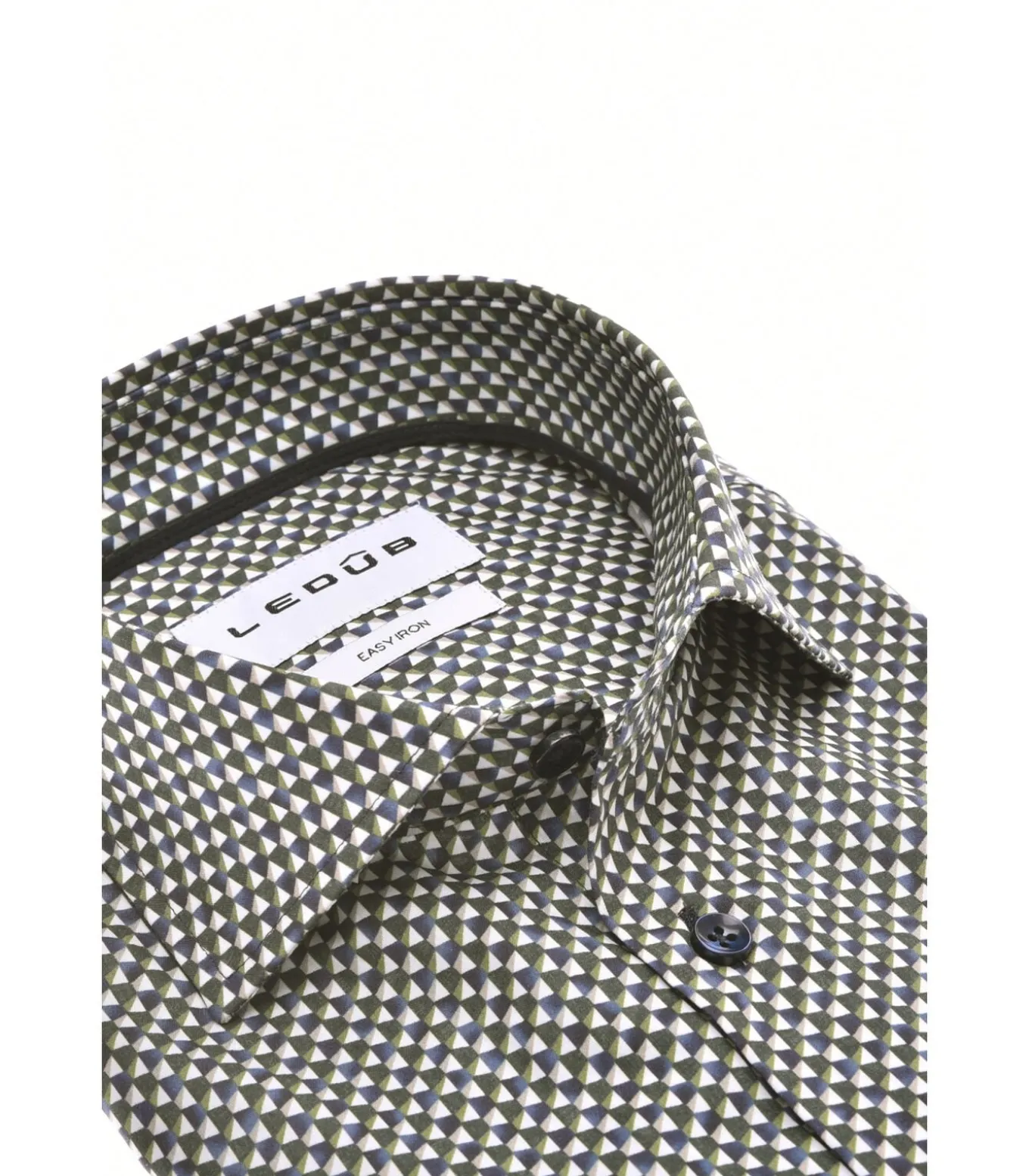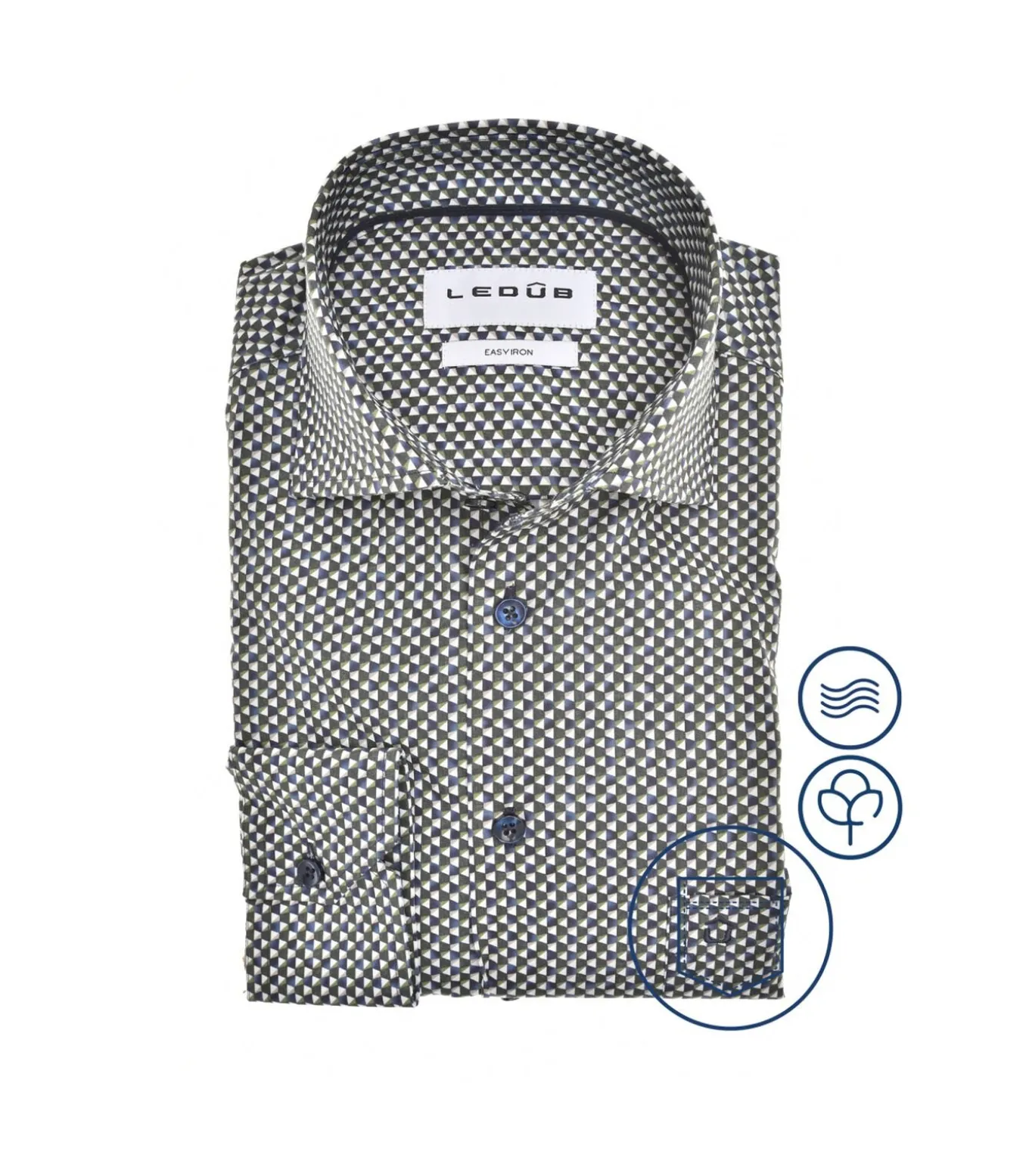 Grafisch dessin in de kleuren donkerblauw groen en beige.
