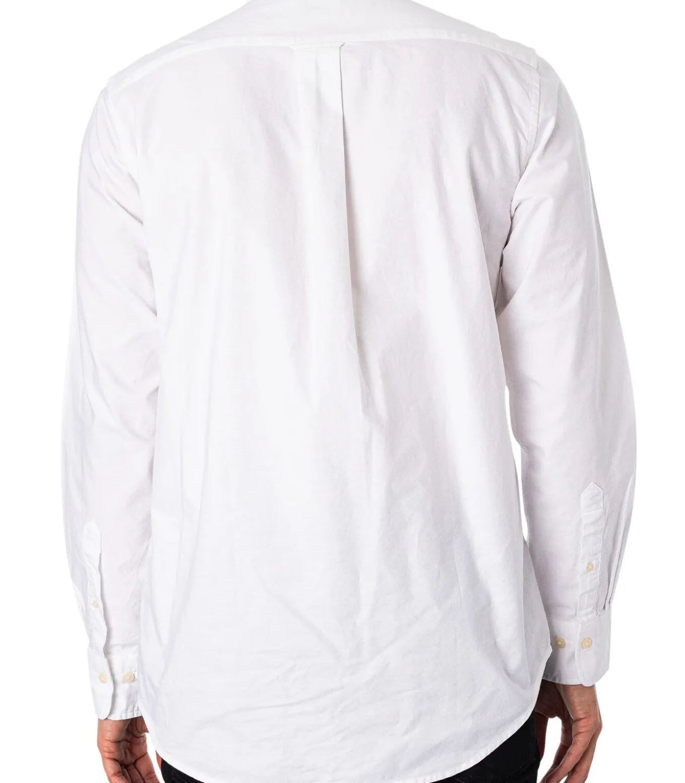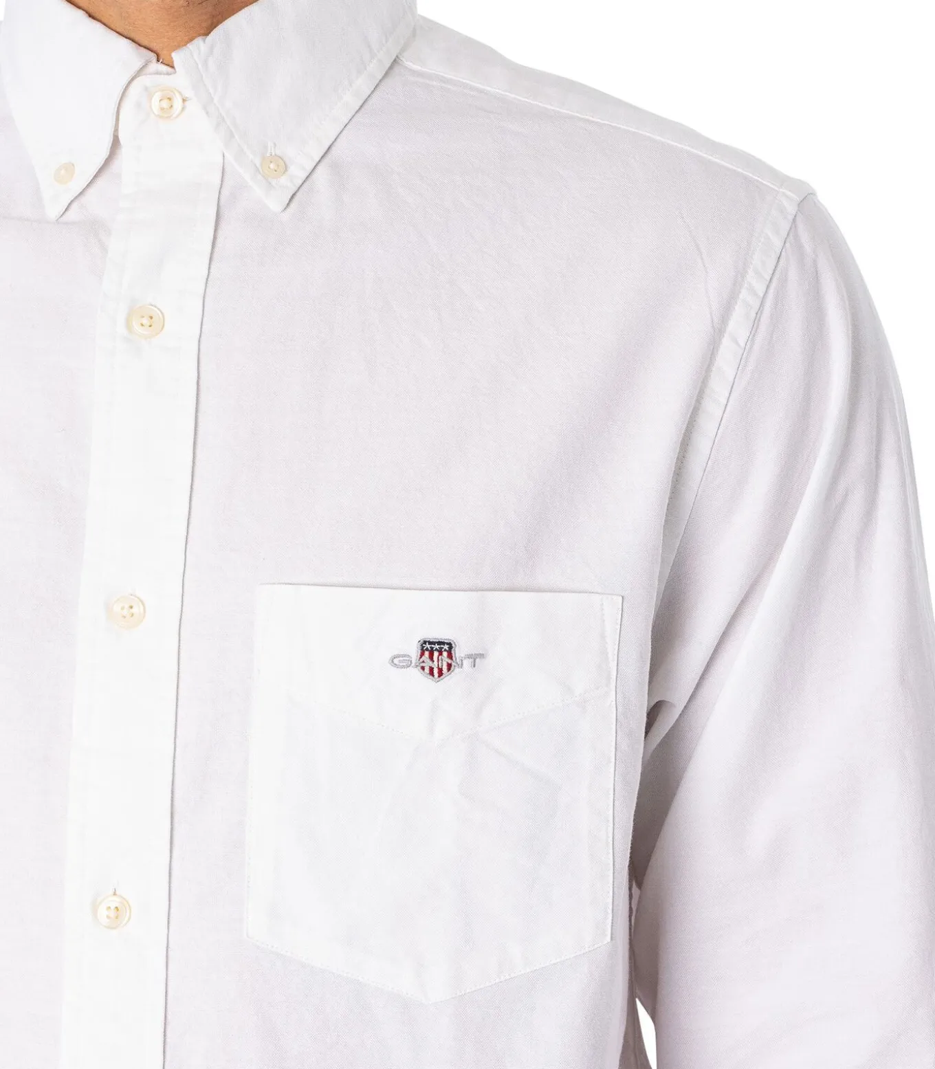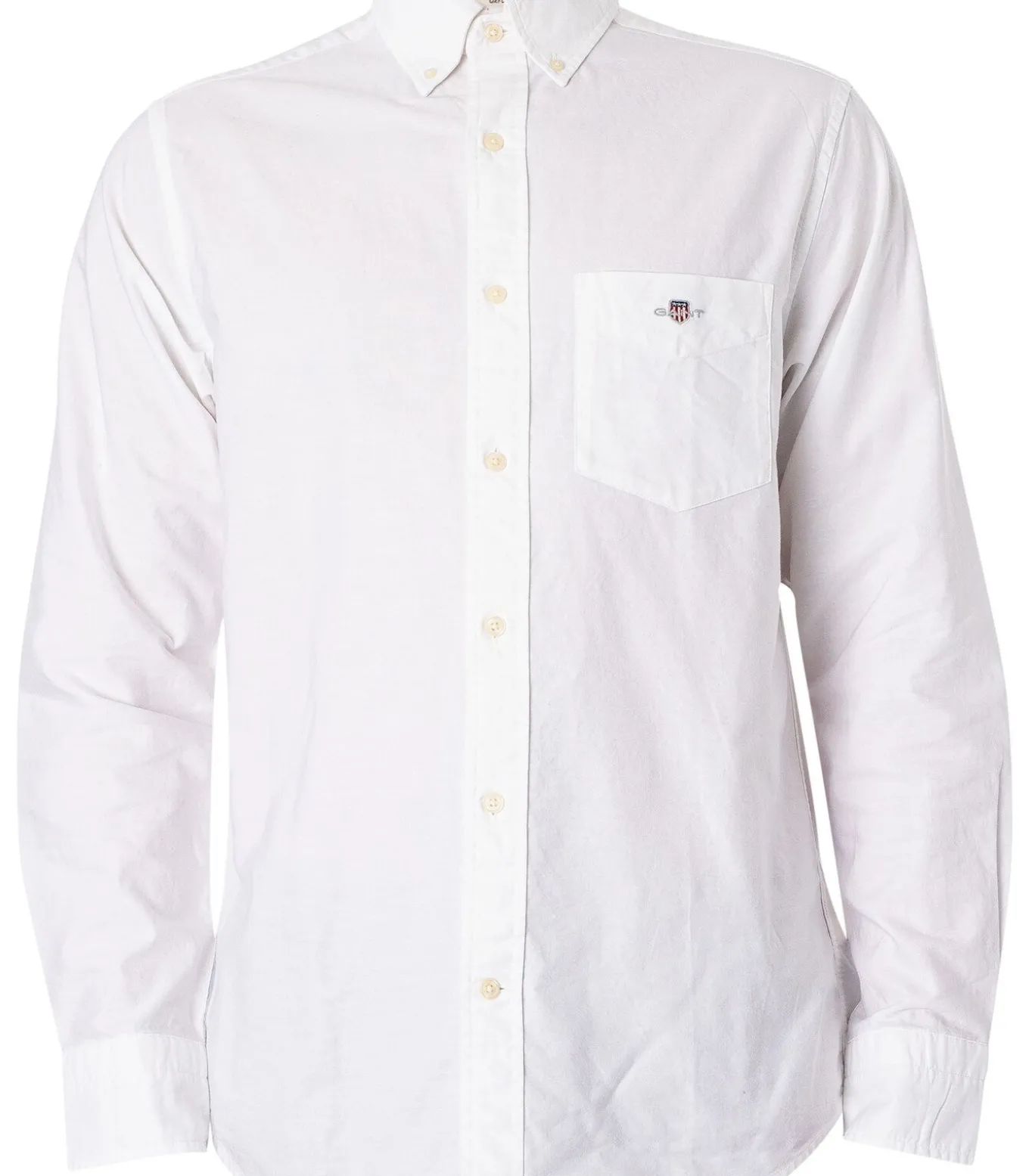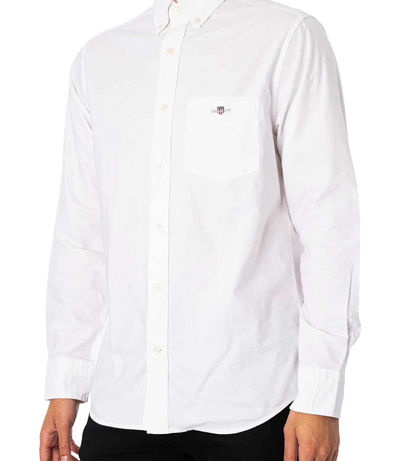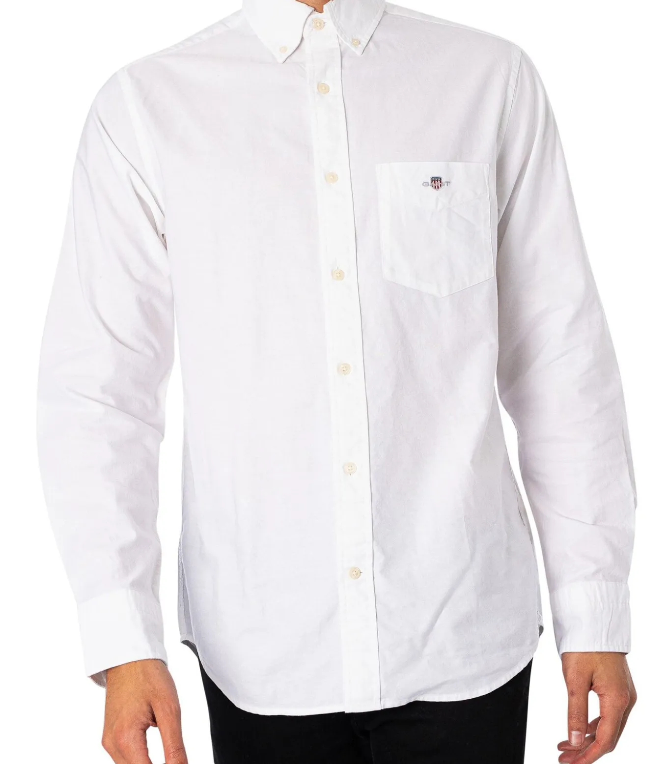 Het witte GANT Regular Oxford–overhemd is een klassieker die nooit uit de mode raakt. Dit overhemd met een geborduurd logo op de borstzak heeft een normale pasvorm, een gebogen zoom en een kraag met knopen, waardoor je er de hele dag verzorgd uitziet. Het is een essentieel kledingstuk voor elke professionele garderobe.