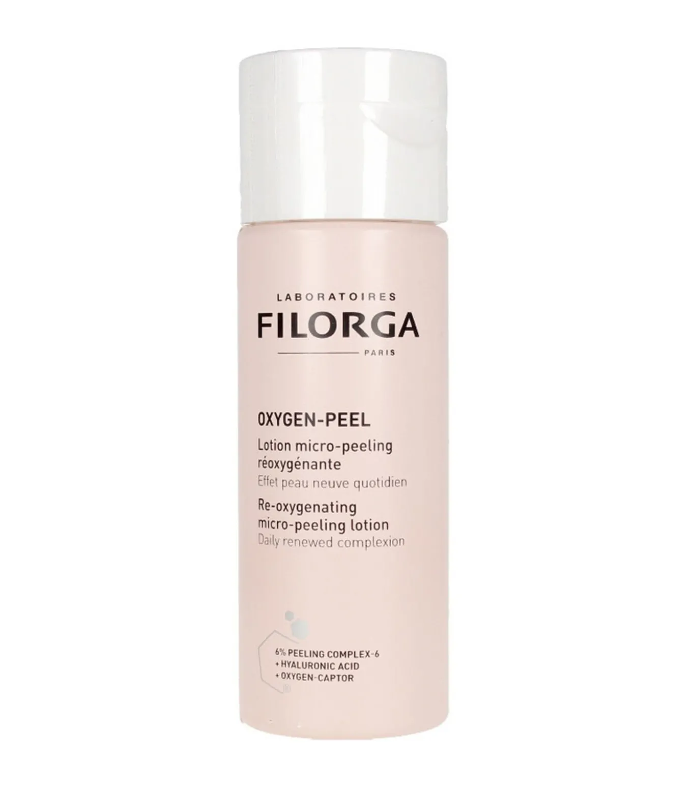 Filorga Oxygen–Peel Micro–Peeling Reoxygenerende Lotion 150 ml is een innovatieve huidverzorging die de huid revitaliseert en haar natuurlijke glans teruggeeft. Verrijkt met een cocktail van 6% zuren en hyaluronzuur, verfijnt deze lotion rimpels, verfijnt poriën en exfolieert de huid zacht. Aangeraden voor het bestrijden van de tekenen van vervuiling, stress of vermoeidheid, levert het een echte zuurstofboost aan je huid, terwijl het de hydratatie verbetert. Ideaal voor vrouwen met een doffe teint, rimpels of zichtbare poriën, herstelt Filorga’s Oxygen–Peel Micro–Peeling Reoxygenerende Lotion de uitstraling van de huid. Door het combineren van bio–actieve zuurstofsensoren en hyaluronzuur, reoxygeneert het de huid, terwijl het intens hydrateert voor een direct opvullend effect. Deze unieke formule helpt de uniformiteit van de teint te herstellen en bestrijdt een vermoeide uitstraling, voor een frissere, stralendere huid. Dermatologisch getest, is Filorga Oxygen–Peel Lotion geschikt voor alle huidtypes. Of je huid nu droog, vet of gemengd is, deze dagelijkse verzorging zorgt voor een gladde, gehydrateerde en gerevitaliseerde huid. De lichte en verfrissende textuur biedt een echt frisse ervaring en werkt diep door voor een stralende, gezonde huid. Een onmisbaar product voor een perfecte teint en een gezonde huid.
