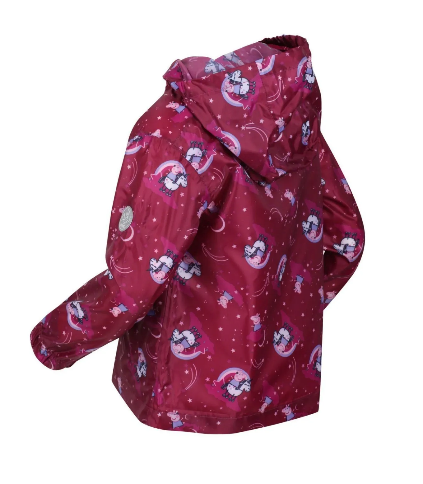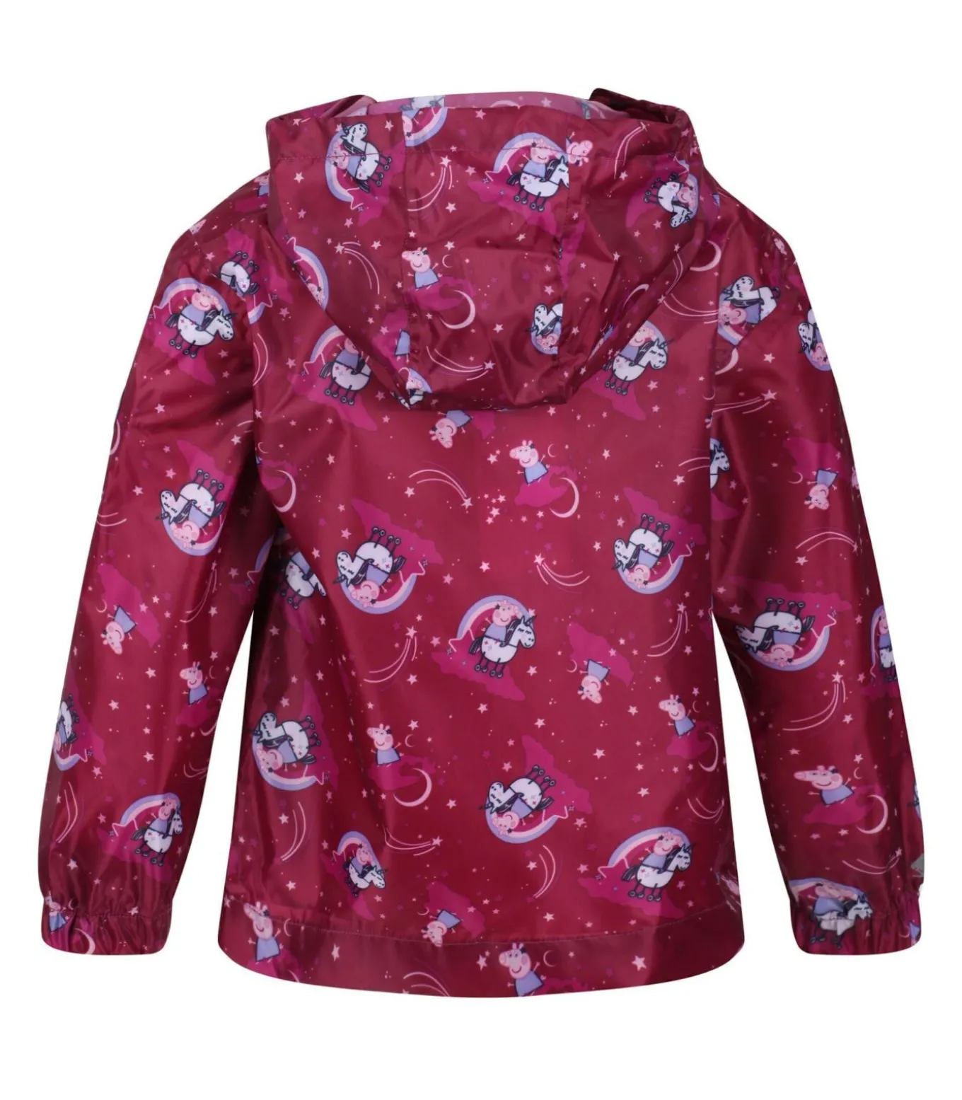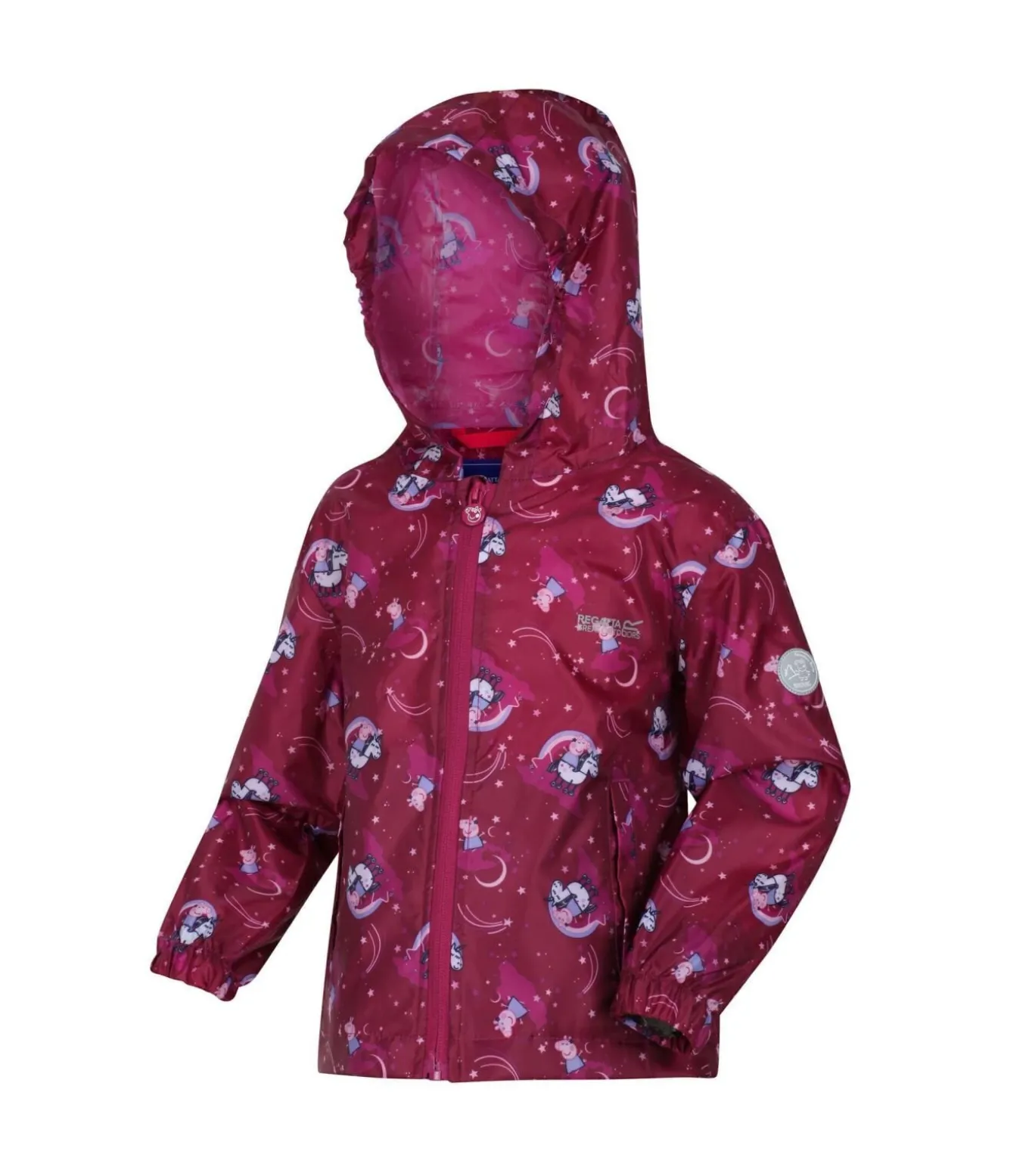 Deze kinderjas van Regatta is ontworpen met Peppa Pig–figuren. Het is gemaakt van 100% polyester stof met een Isolite en polyamide mix waardoor het ademend, duurzaam, waterafstotend en waterdicht is. De naden zijn getapet voor extra bescherming tegen de elementen. Het ontwerp met capuchon heeft een elastische, vastgegroeide capuchon voor bedekking en comfort. Er zijn twee zakken onderaan voor opbergruimte. De rits sluit. De jas is packaway voor compact opbergen en voldoet aan de waterdichtheidseisen van 5000g/m2/24hrs.