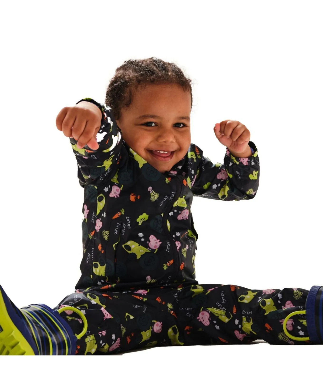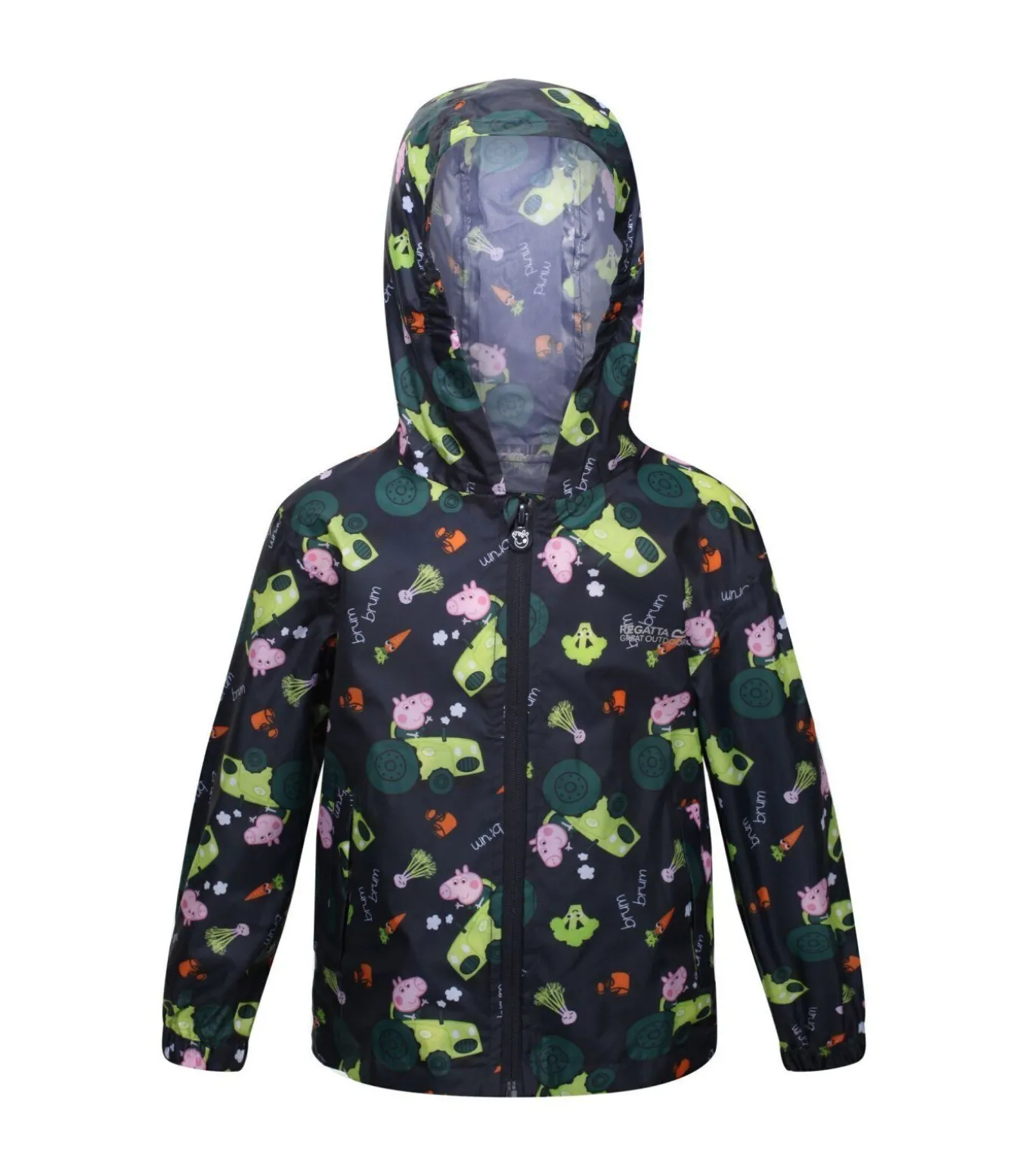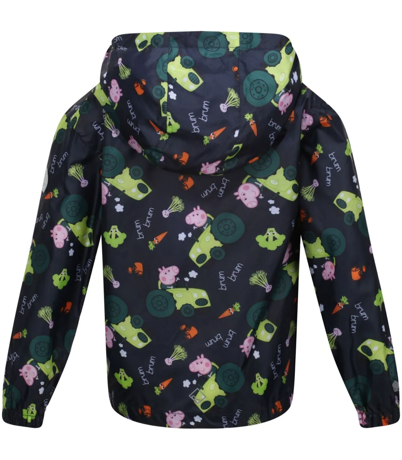 Deze lichtgewicht en ademende kinderregenjas is voorzien van Peppa Pig logo en personages. Hij is gemaakt van 100% polyester met een waterdichtheid van 5000 mm en een DWR–afwerking om water af te stoten. De ongevoerde jas heeft lange mouwen, een elastische capuchon en twee zakken. Belangrijke details zijn een verborgen ritssluiting, elastische manchetten en hals, getapete naden voor bescherming en een vastgegroeide capuchon. Het officieel gelicenseerde ontwerp is voorzien van badges en logo’s, waaronder Peppa Pig en een tractor. Dankzij het compacte packaway–ontwerp is de jas gemakkelijk op te bergen of mee te nemen op reis.
