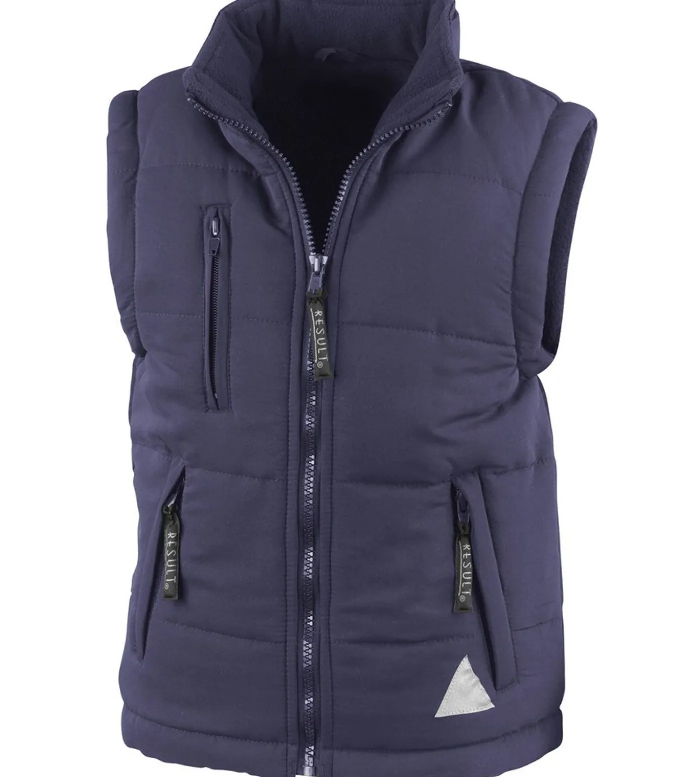 Result Marineblauw Padded Body Warmer is gemaakt van 100% Polyester. Het heeft een vulling van 240gsm en de lining bestaat uit Fleece. De huid is microvezels geperforeerd. Dit product heeft een eenvoudig ontwerp en wordt gekenmerkt door waterafstotende en winddichte technologie. Het hebt elastische armpartijen met gewatteerde, sluitbare label, gescheurde kraag en mouwloos kap. Deze body warmer beschikt over 2 voorzakken, 1 borstzak en rijen. Het wordt vastgezet via volledige ritssluiting. De passende grootte is er beschikbaar voor kinderen van 2–3 jaar met een lengte van 21 in., 5–6 jaar met een lengte van 24 in. en 9–10 jaar met een lengte van 39 in.