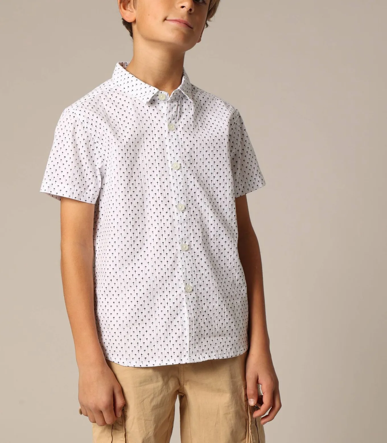 Overhemd van 100% katoenModel met korte mouwenModel met fijne patronenKnoopsluiting op de knoopsluitingOverhemdkraag met knopenHet PAGOS overhemd is een model gemaakt van 100% katoen, ideaal om het ultieme comfort van je jongen te garanderen. Met zijn mooie fijne patronen, zijn mooie felle kleur en zijn zeer elegante rechte snit is dit overhemd ideaal voor het creëren van chique looks! Aarzel niet om hem te combineren met een rechte jeans, een effen chinobroek of zelfs een mooie rechte short en effen witte sneakers. Bij koeler weer kun je hem combineren met een trui met ronde hals.