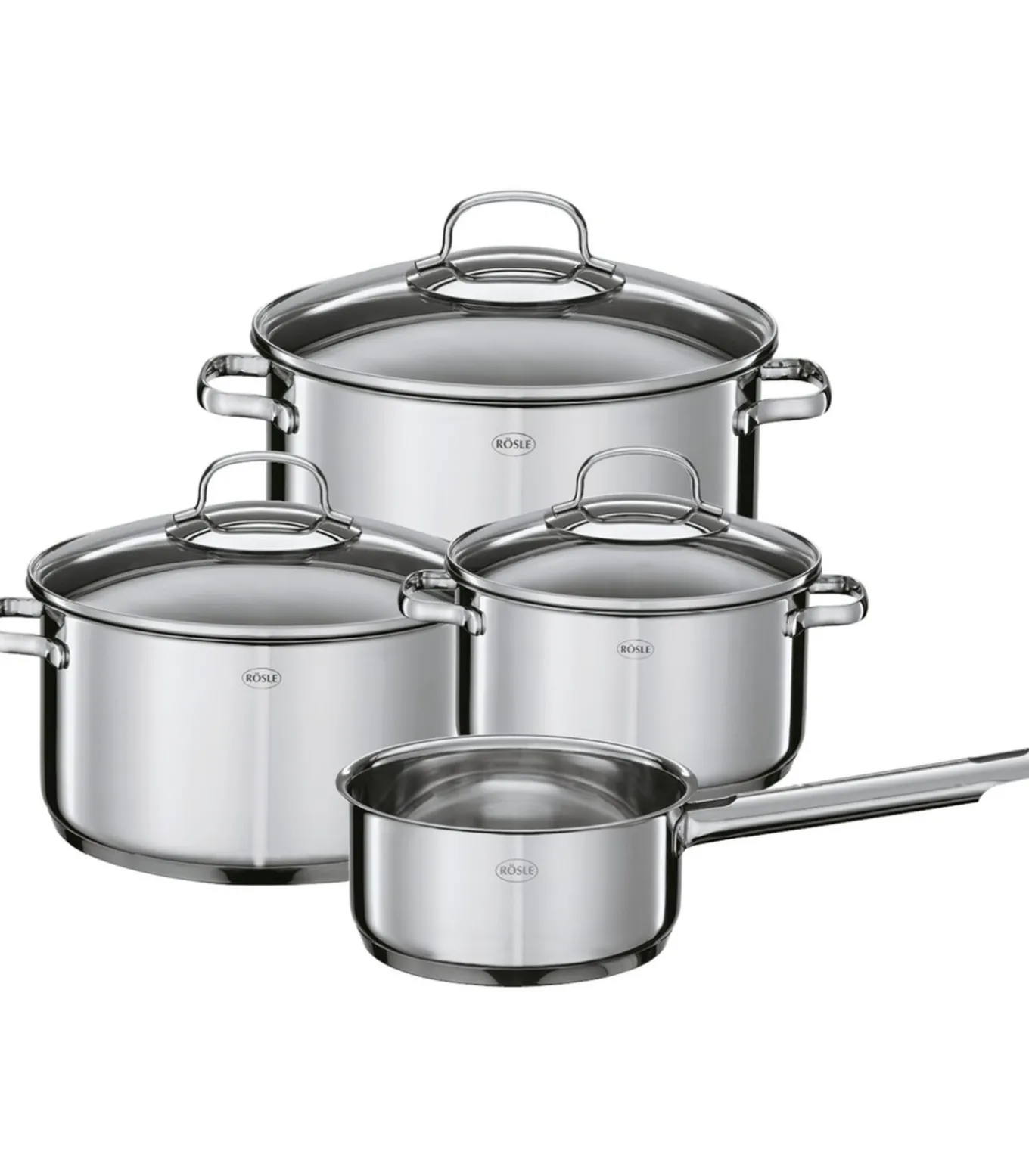 Met de Rosle 4–delige pannenset Elegance set kan je weer koken zoals dat bedoeld is. Zo hebben alle producten een fraai design en zijn ze erg multifunctioneel en duurzaam. Een voorbeeld daarvan is dat de handvatten op een slimme manier ontworpen zijn zodat deze niet heet worden tijdens het koken. De verschillende maten maken het mogelijk om voor elk gerecht een geschikte pan te kiezen. De glazen deksel van 16 cm past ook op de steelpan. Het roestvrijstale materiaal is daarnaast van zeer goede kwaliteit dat vaatwasserbestendig is.Deze Rosle pannenset bestaat uit: 1 steelpan = ø16 cm – 1.5 Liter1 kookpan = ø16 cm (met deksel) – 2 Liter1 kookpan = ø20 cm (met deksel) – 3.6 Liter1 kookpan = ø24 cm (met deksel) – 5.9 Liter