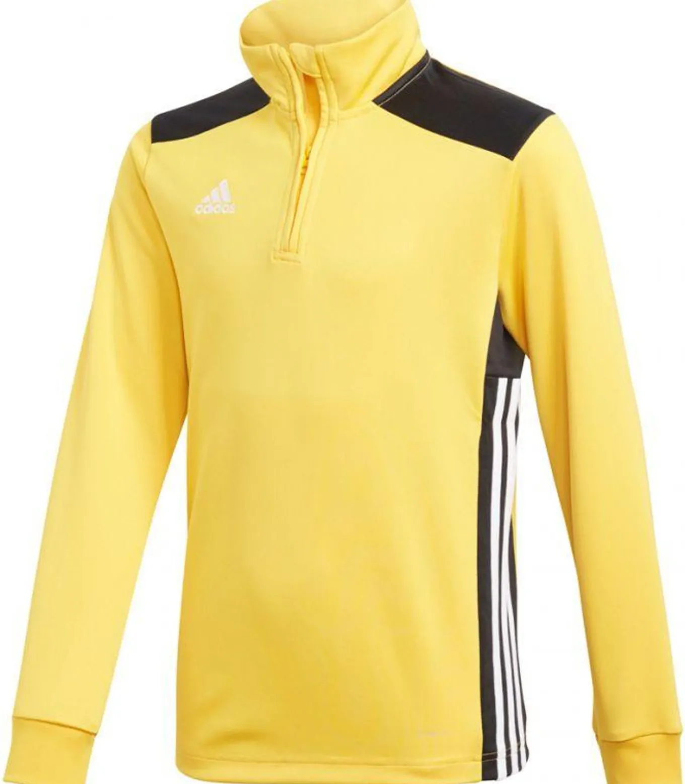 Adidas REGISTA 18– Geel, Sweatshirt – Deze sportieve sweatshirt met contraste strepen en gorduur op het logo is gemaakt van 100% polyester. Het toepassingsgebied hiervoor is opleiding. Dit sweatshirt heeft een Climalite–technologie voor goed afkoelen, vochtafgevende contrastende schouders en elastiekse manchetten met lange mouwen en een staande kraaghalslijn. Deze pull over sweatshirt heeft 2 zijzakken met ritsen en is 24 inch in grootte, geschikt voor 5–6 jaar.