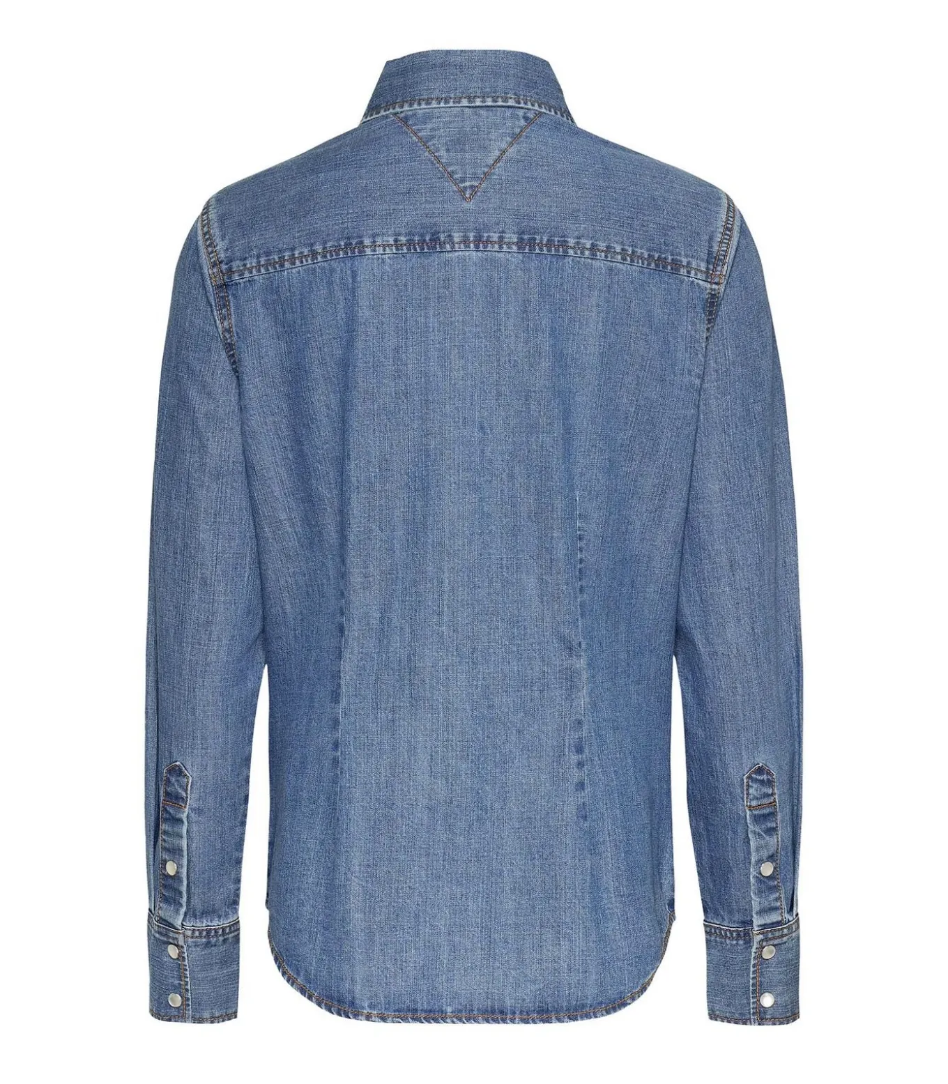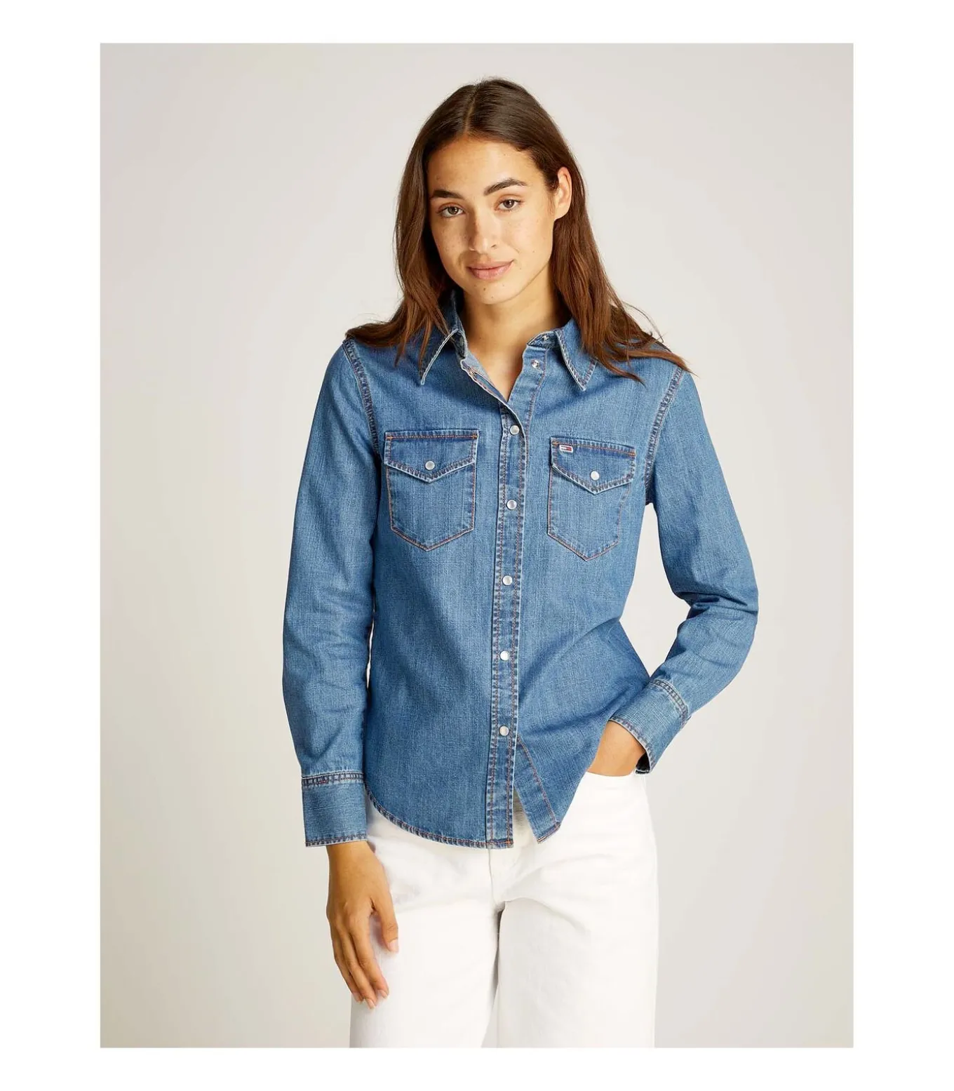 * Kleur: Denim Medium * Mouwen: Lang * Halslijn: Semi–spread kraag * Pasvorm: Regular fit * Sluiting: Drukknopen * Details: Contrasterende stiksels, all–over vervaging, twee klep– en knoopzakken op de borst, Tommy Jeans vlagpatch op de zak * Gebruik: Perfect voor een casual en relaxte look, ideaal te combineren met een broek of rok voor een western chic stijl.