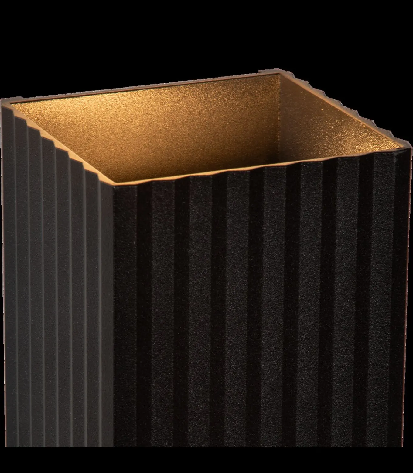 De Ribble is een stijlvolle wandlamp voor binnen, met een rechthoekige vorm en een geribbelde structuur. De metalen lamp is zwart aan de binnen– en buitenkant, wat zorgt voor een strakke en moderne uitstraling. De afmetingen van de lamp zijn 8,1 x 7,7 cm, met een hoogte van 18 cm. De Ribble heeft één lichtbron die naar boven en naar beneden schijnt, waardoor er een mooi lichteffect ontstaat op de muur. De Ribble is een ideale lamp voor in de hal, woonkamer of slaapkamer. Zoekwoorden : Wandlamp, muurverlichting, spot, zwart, metaal, industrieel, landelijk