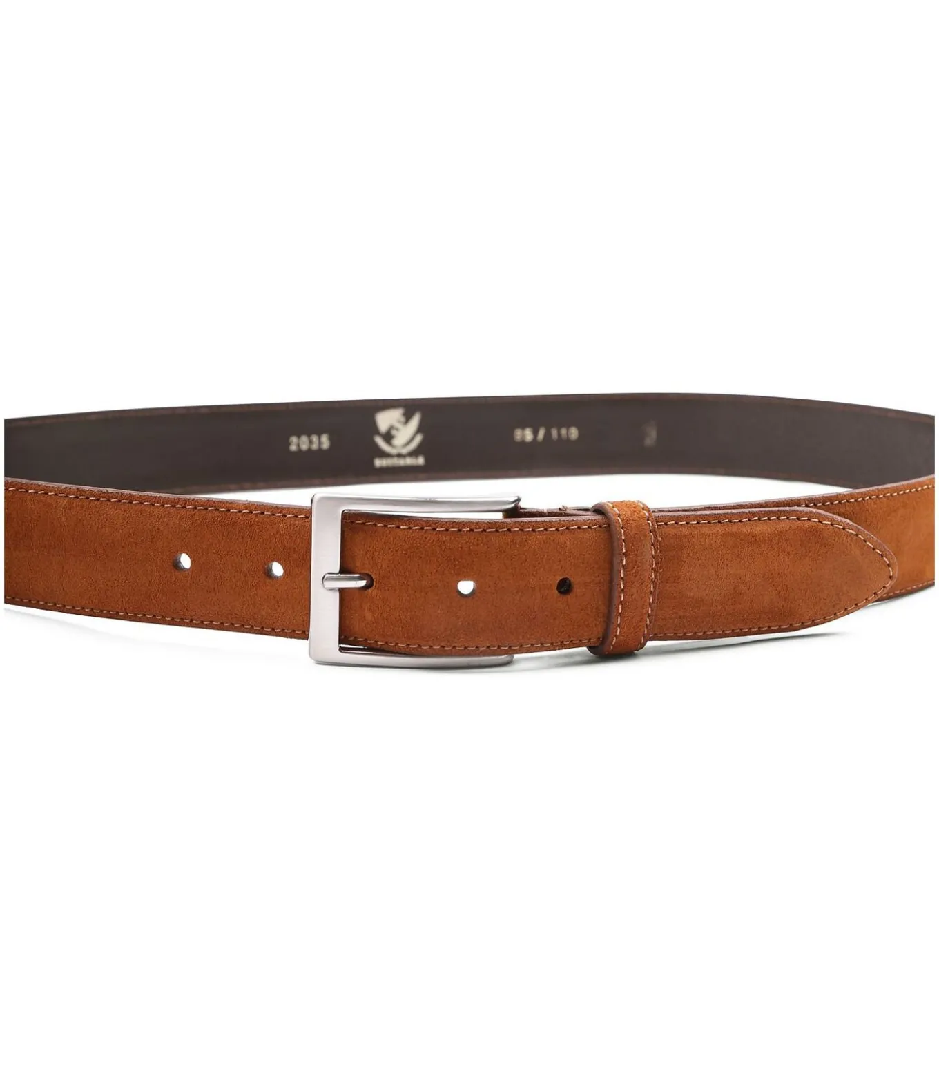 Je outfit is pas echt compleet met deze lederen riem van Suitable. De herenriem heeft een bruine kleur in een suede en is voorzien van een zilverkleurige gesp. Draag de riem bij je favoriete jeans, een chino of een pantalon. Bruin gekleurdGemaakt van leer3,5 centimeter breed