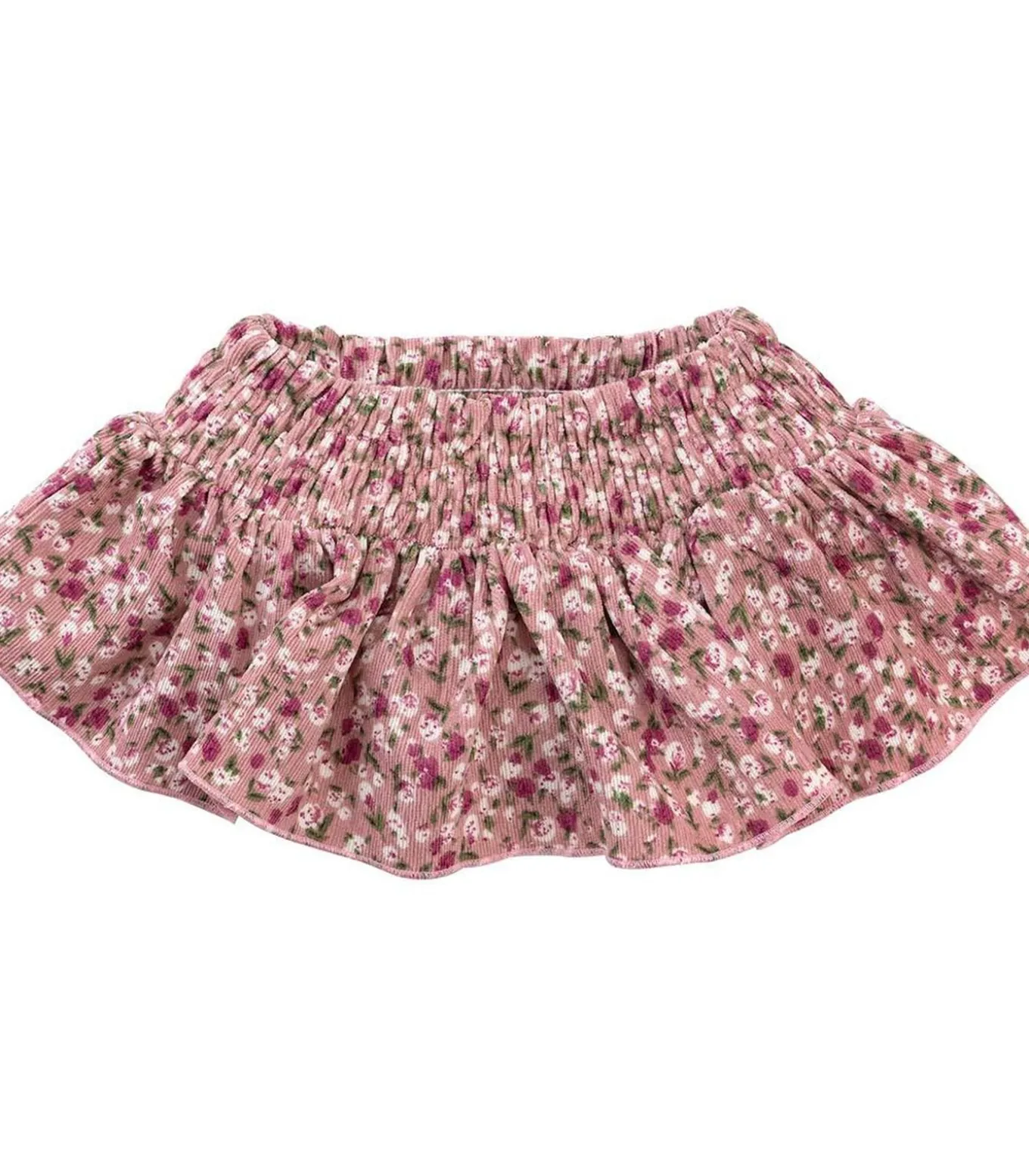 Rokje met bloemenprint op elastiek. Tot 2 jaar heeft het rokje een pamperbroekje. Leuk te combineren met het witte t–shirtje met dezelfde print en het paars/ roze giletje.