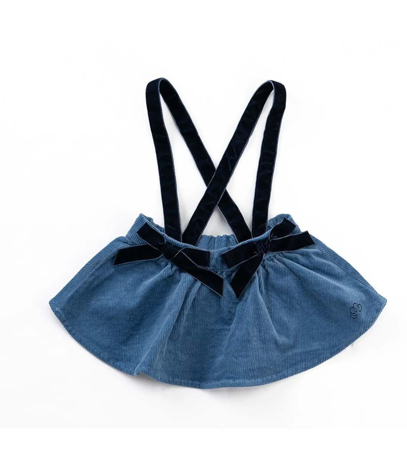 Blauw rokje in ribfluweel met bretellen en twee strikjes. Het rokje is verstelbaar in de taille.