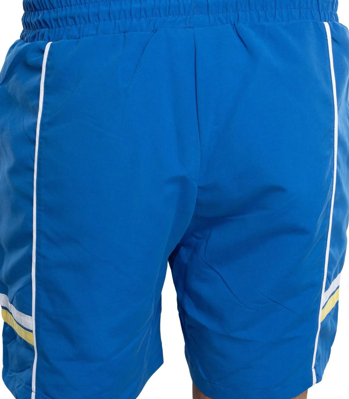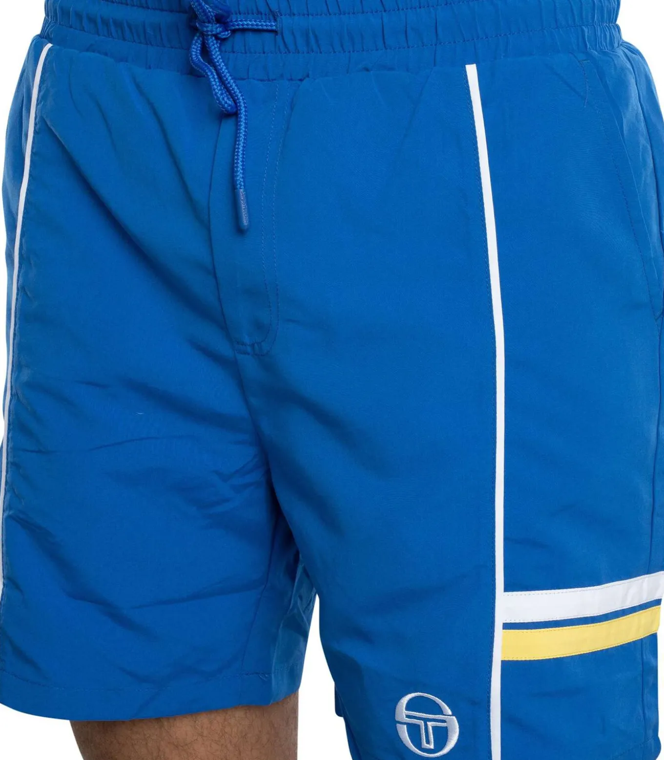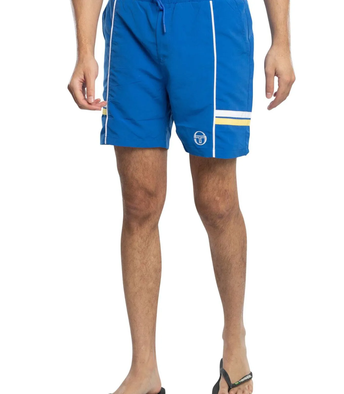 De Sergio Tacchini Romolo zwemshorts in Nautical Blue/Daffodil bieden een gedurfde, sportieve look met premium comfort. Met een geborduurd logo op de voorkant combineren deze zwemshorts prestaties met klassieke Italiaanse sportkledingstijl. De elastische taille met trekkoord biedt een verstelbare pasvorm, terwijl de open zakken praktisch zijn. Ontworpen met een ademende mesh voering, bieden ze ondersteuning en comfort, of je nu zwemt of ontspant in de zon.