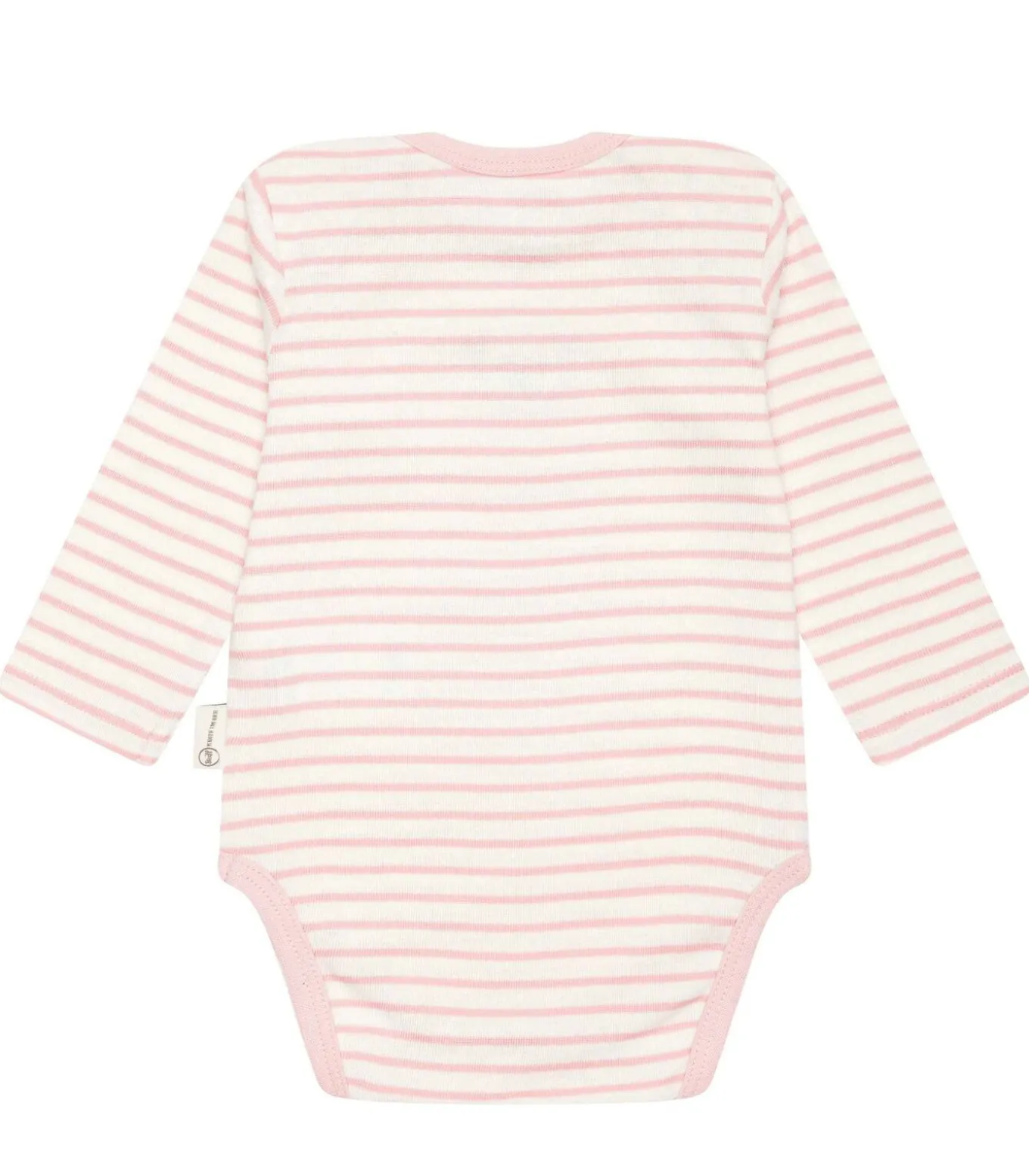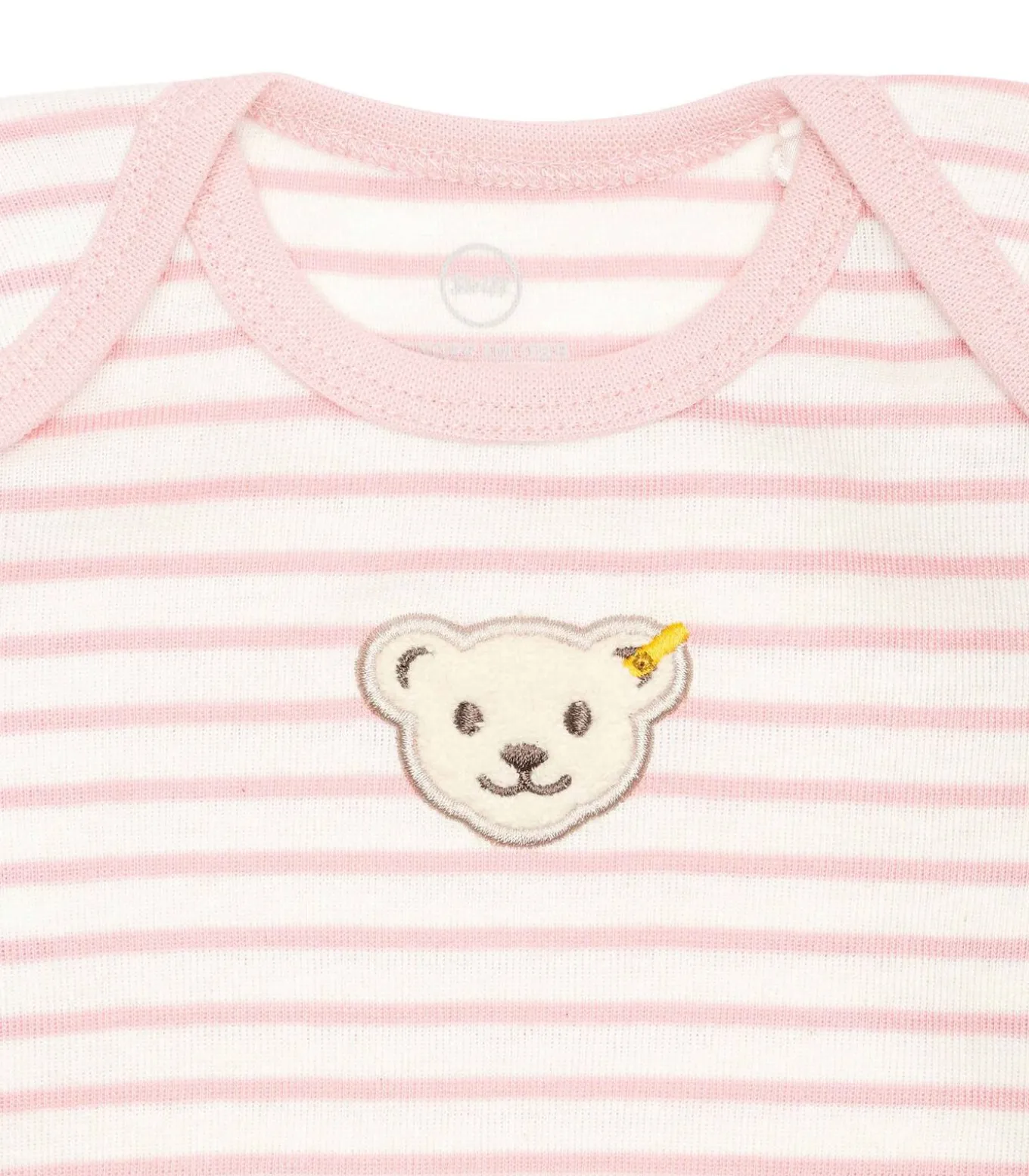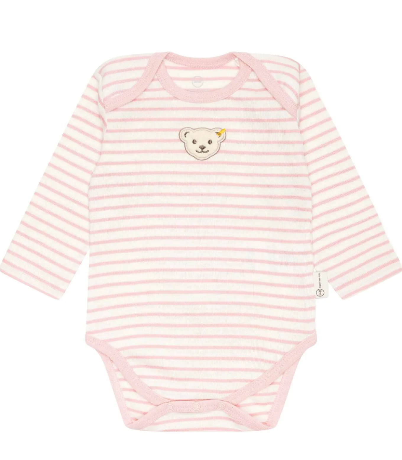 Babyrompertje van het merk Steiff. Gestreepte romper met drukknopen in het kruis om het aan– en uitkleden te vergemakkelijken en een kleine berenkop op de voorkant. Lange mouwen met opstaande kraag. Comfortabel om te dragen dankzij zuiver katoen.