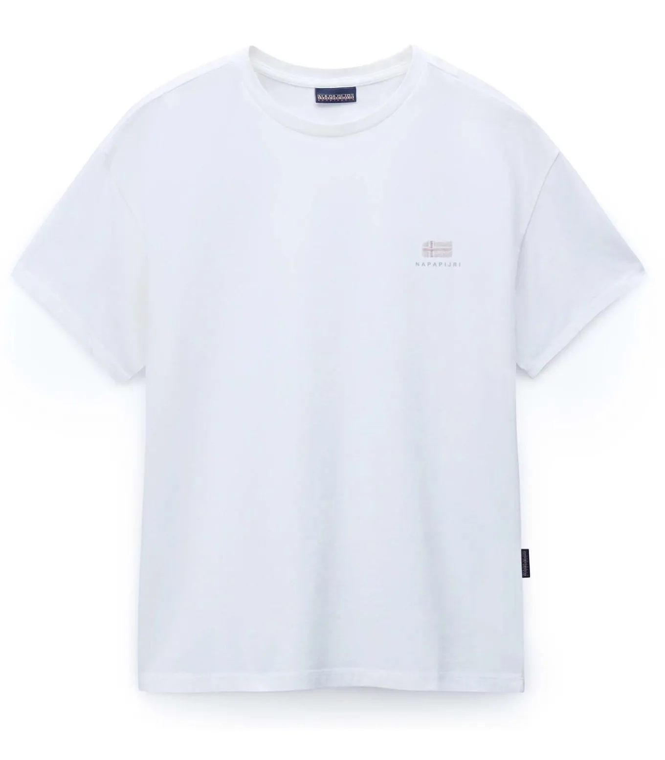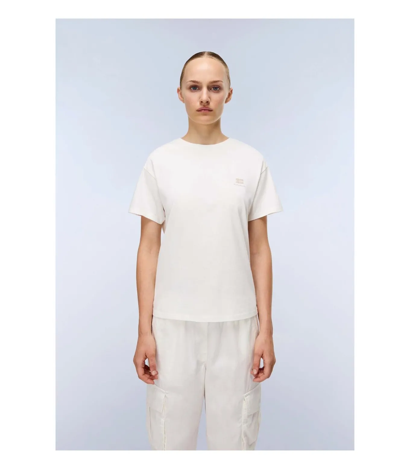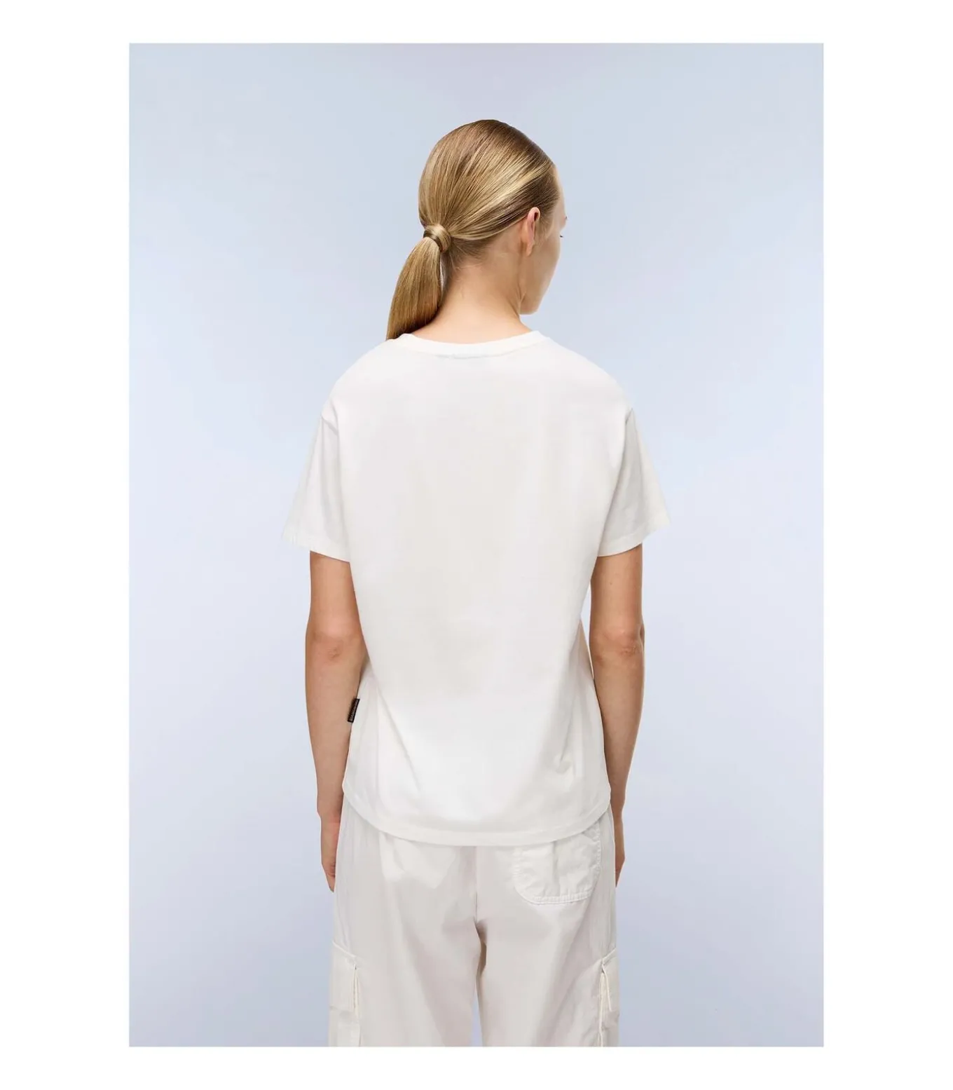 Kleur: White Heron. Samenstelling: 100% katoen (Good Earth Cotton®). Mouwen: kort. Halslijn: ronde hals. Pasvorm: relaxed. Details: T–shirt met logoprint en discreet borduursel op de borst. Duurzaamheid: gemaakt van Good Earth Cotton®, volledig traceerbaar en geteeld met behulp van regeneratieve methoden om natuurlijke hulpbronnen te behouden. Gebruik: perfect voor een comfortabele en minimalistische dagelijkse stijl, te dragen met een jeans of onder een licht jasje.