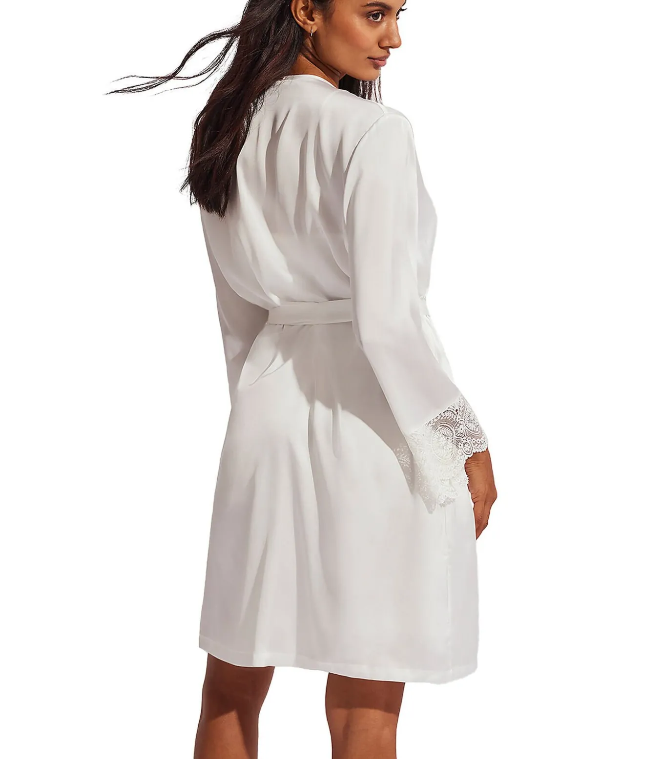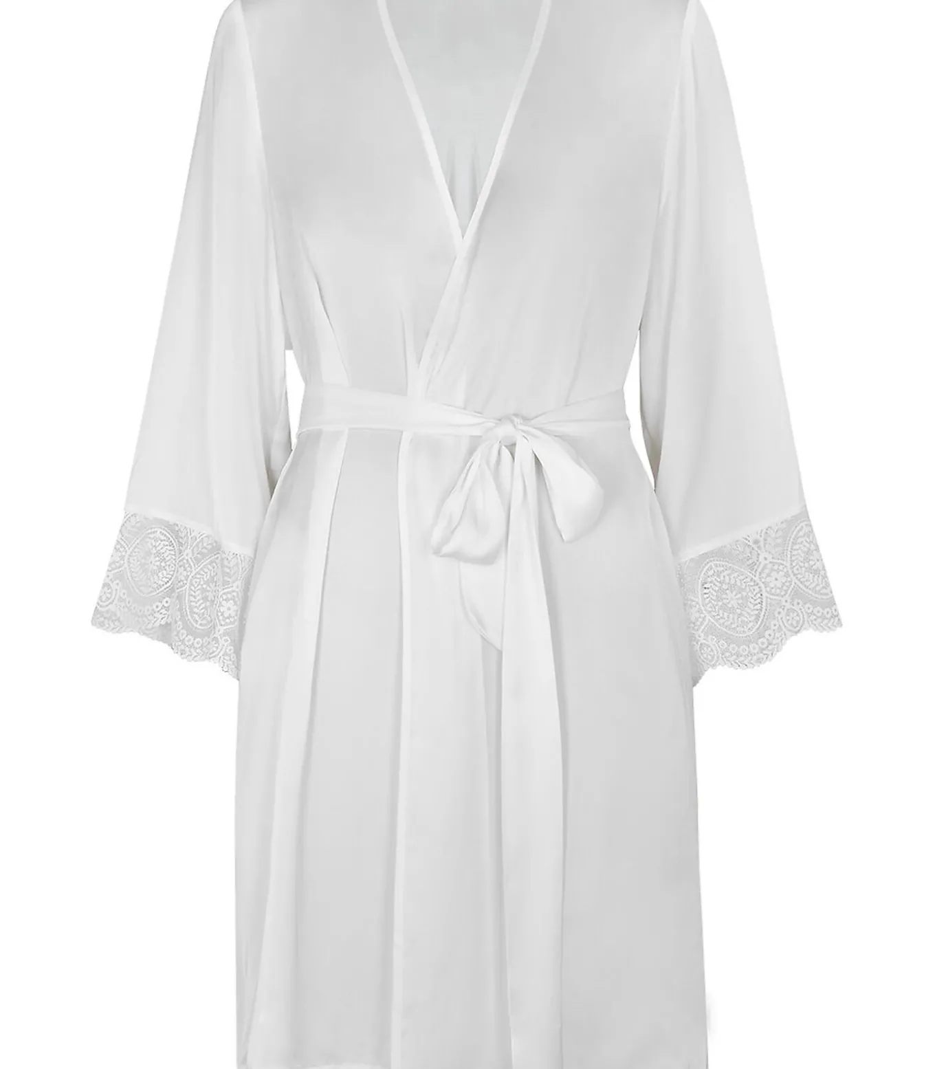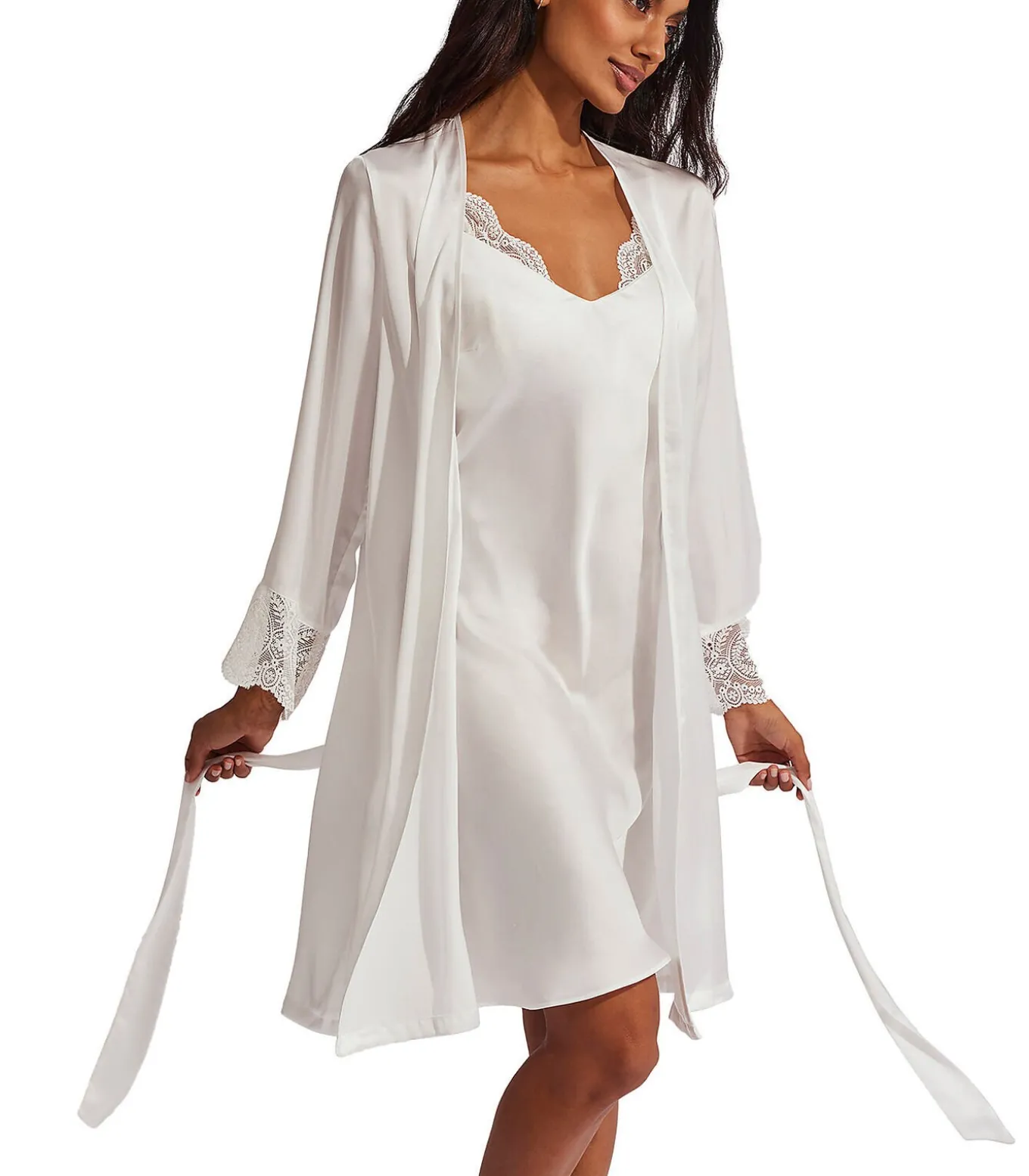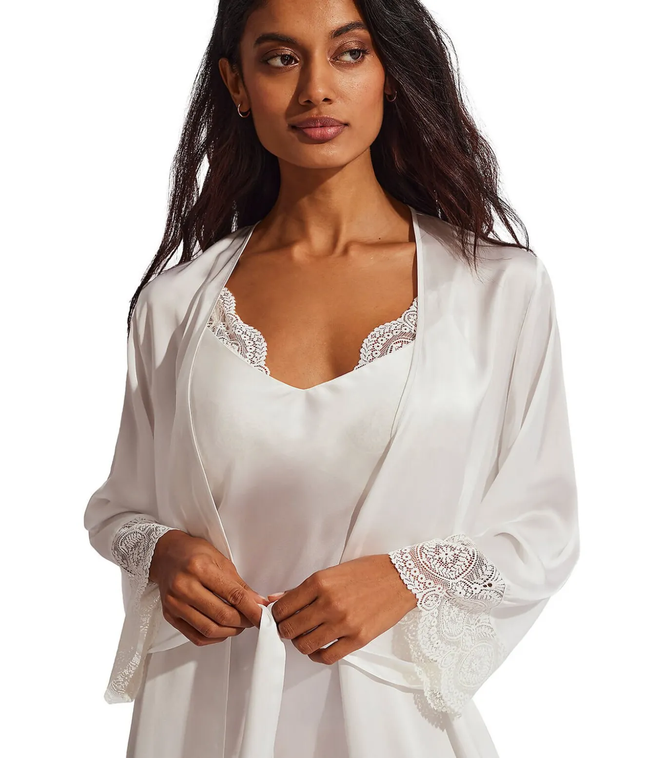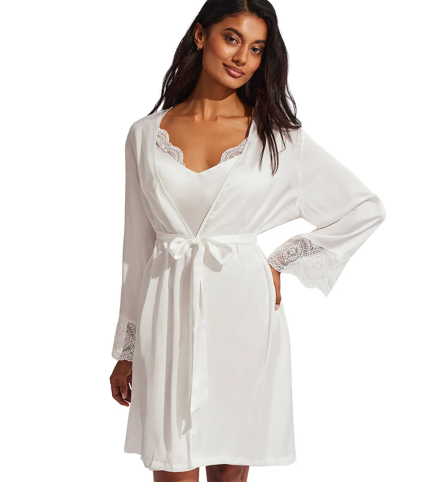 Schitterende negligé van licht satijn versierd met een delicaat kanten inzetstuk onderaan de negligé. Het kan gesloten gedragen worden met een ceintuur die in de taille geknoopt wordt.