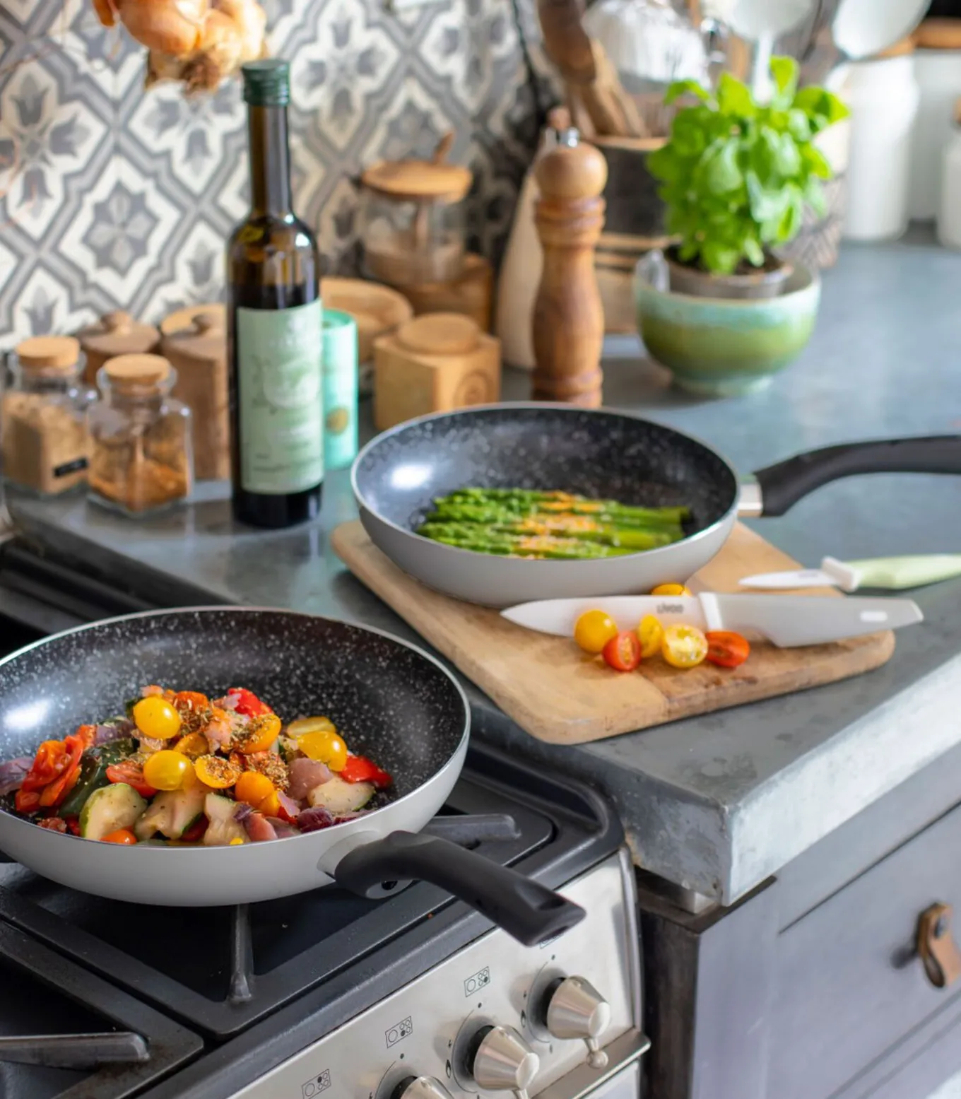 Binnenlaag met antiaanbaklaag en steenlook afwerking, Ø 24 en 28 cm, 2,5 mm dik, Hittebestendige, zacht aanvoelende handgreep met siliconencoating, Geschikt voor alle branders inclusief inductie, Kookt zonder toevoeging van vet