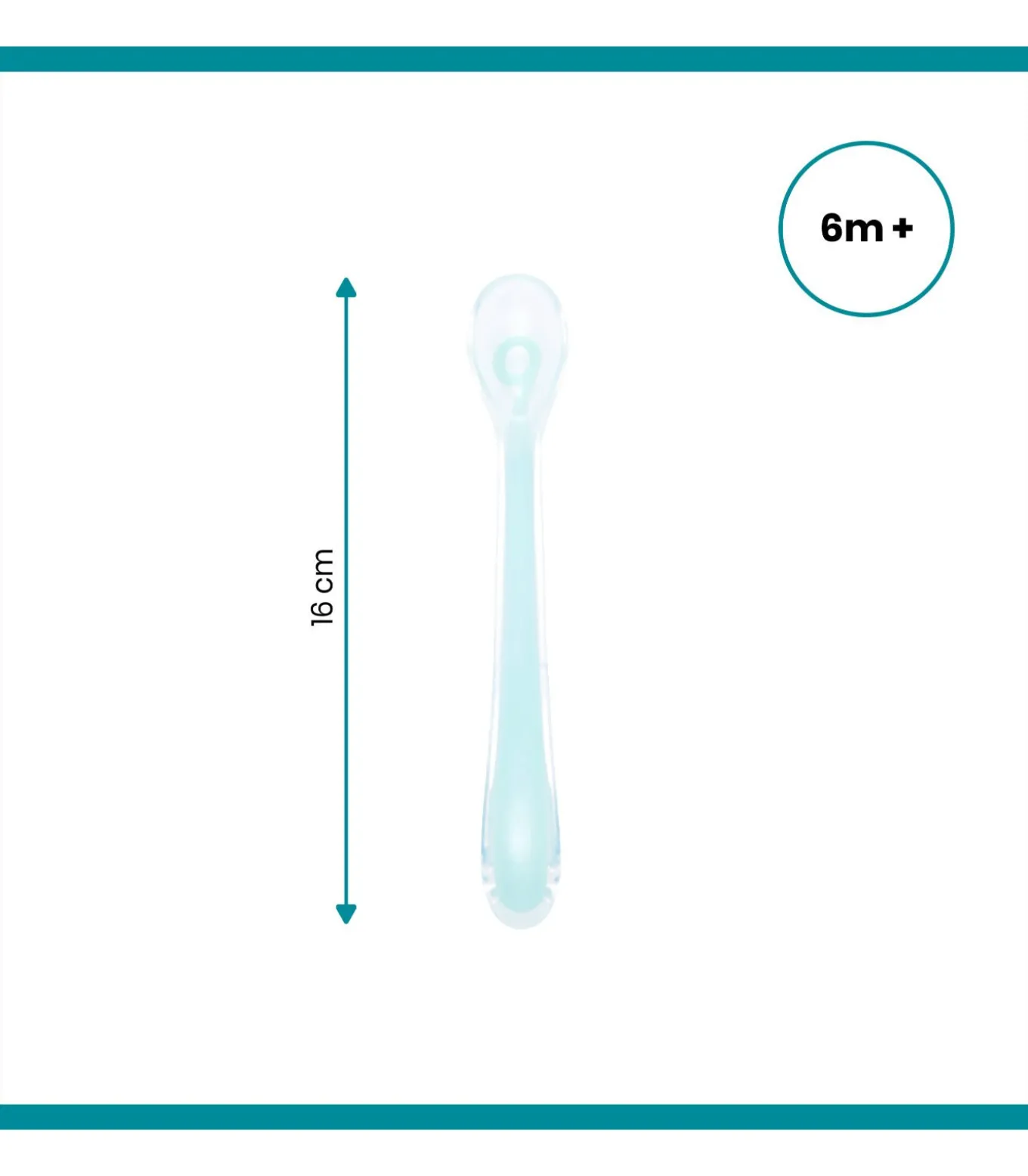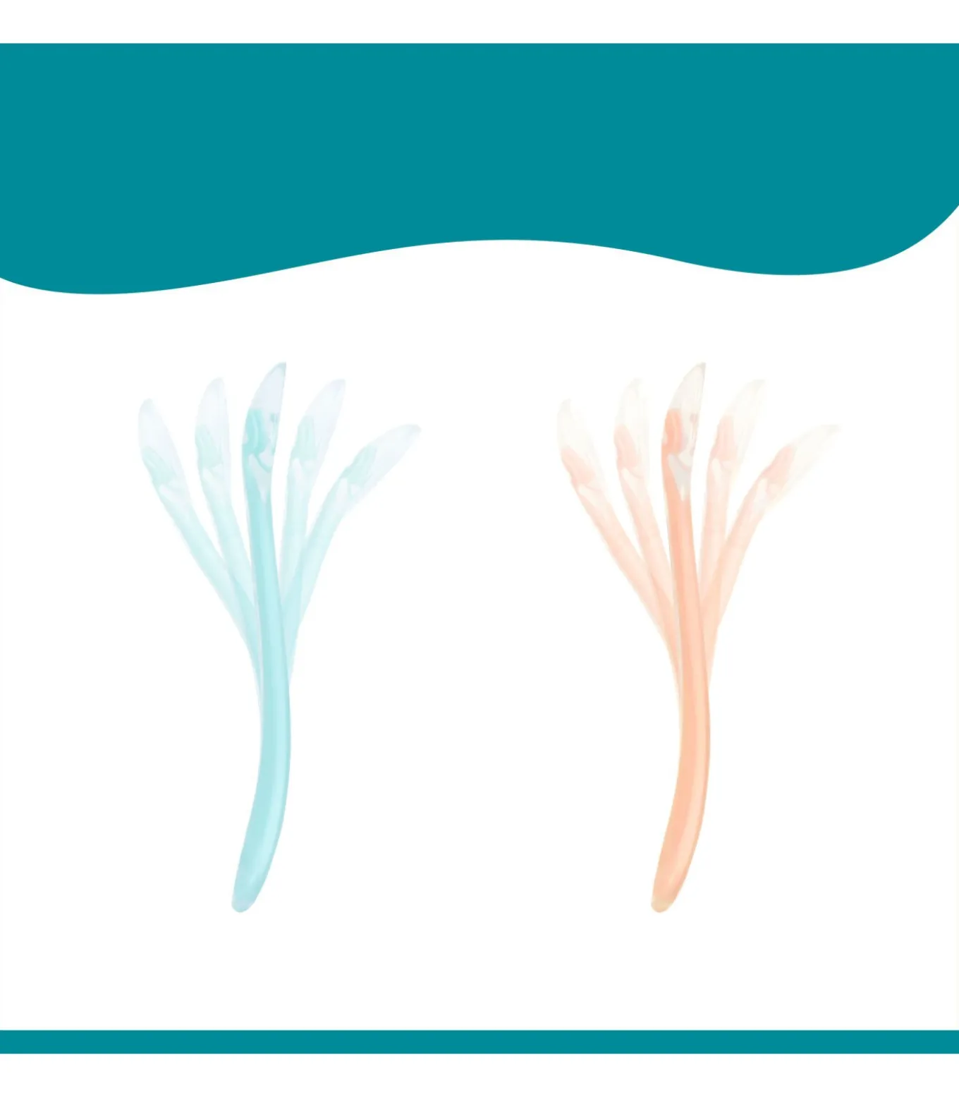 Set van 5 lepels in trendy kleuren In zachte siliconen, ideaal voor het starten van voedseldiversificatie Perfect formaat voor kleine monden Ontworpen om het tandvlees van de baby te ontlasten Vaatwasmachinebestendig, BPA–vrij