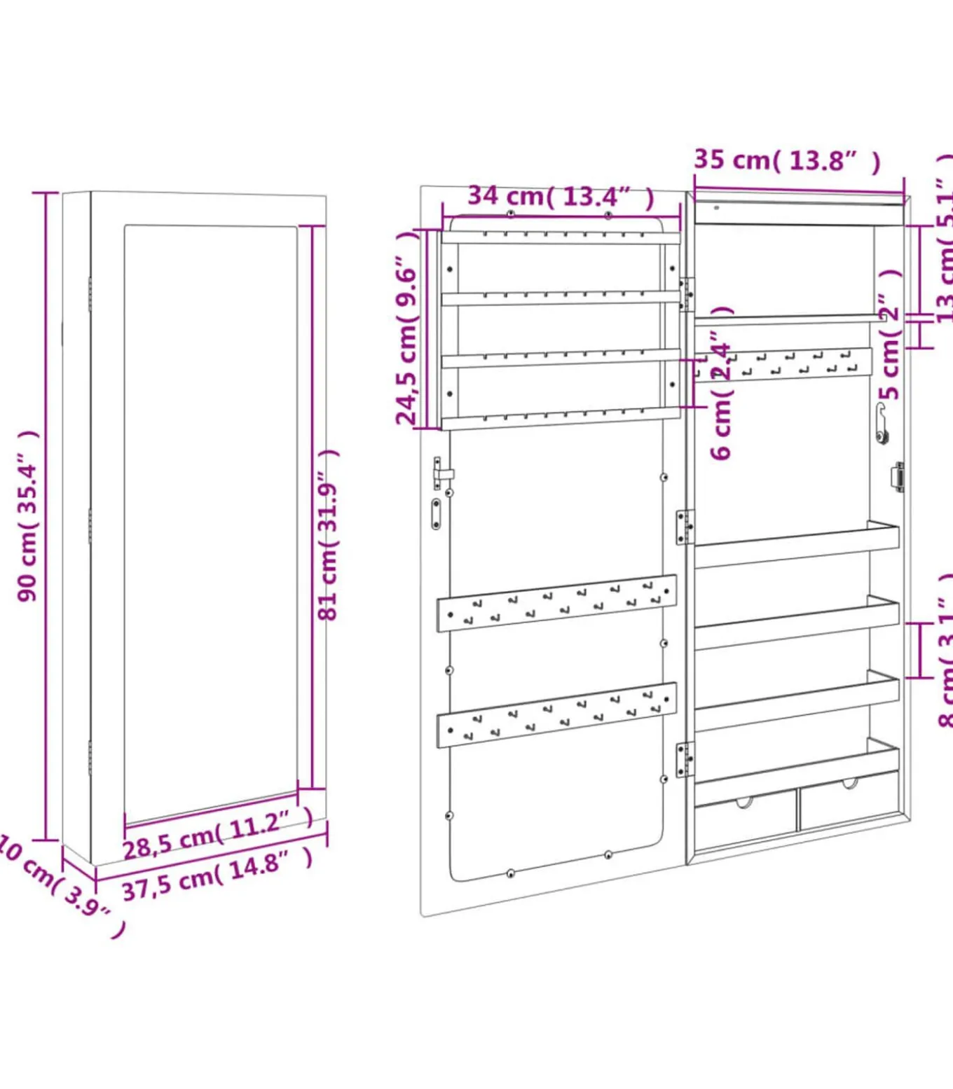 Voldoende opbergruimte: de spiegel met opbergruimte heeft 2 lades en veel haakjes, hangers en plankjes om je sieraden netjes geordend en binnen handbereik te houden.
