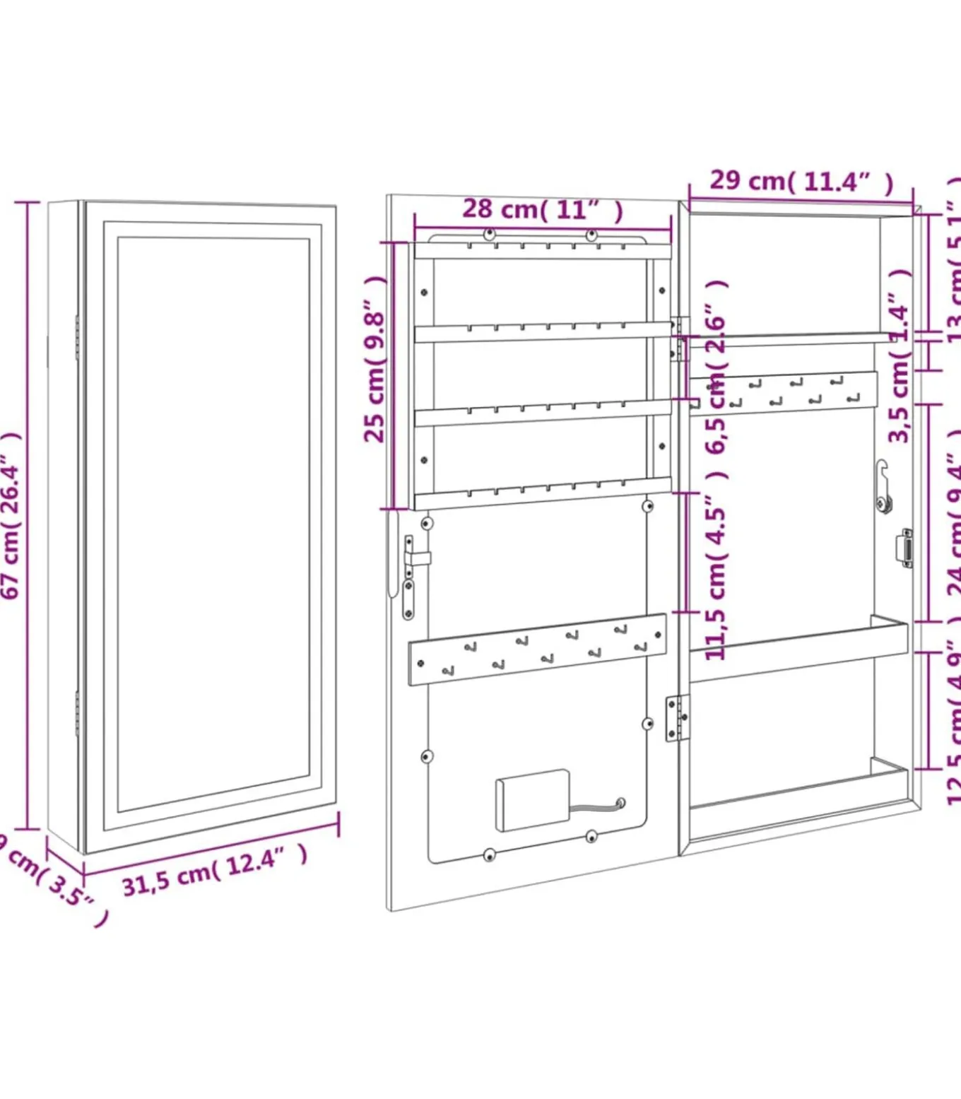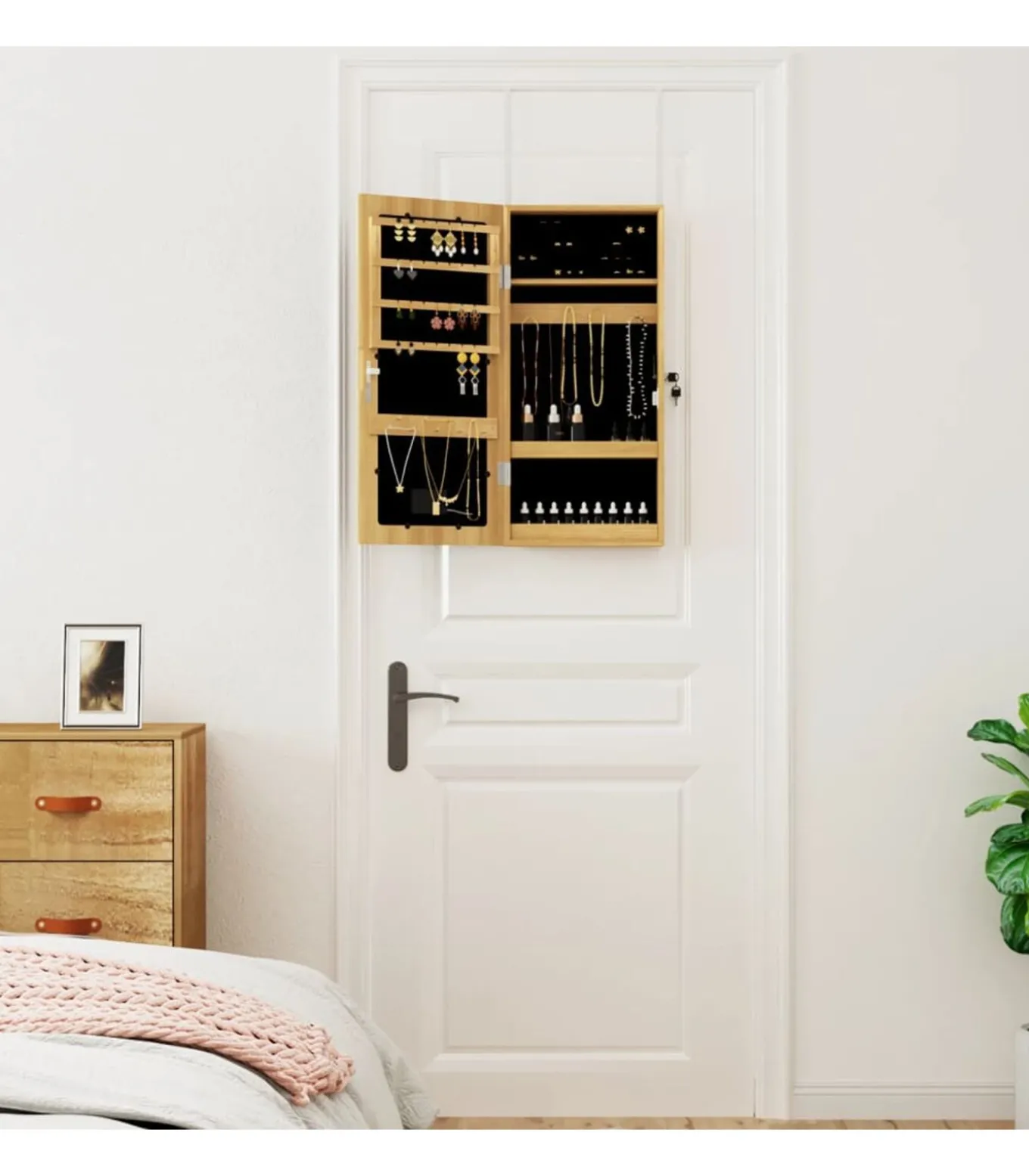Voldoende opbergruimte: de spiegel met opbergruimte heeft veel haakjes, hangers en plankjes om je sieraden netjes geordend en binnen handbereik te houden.
