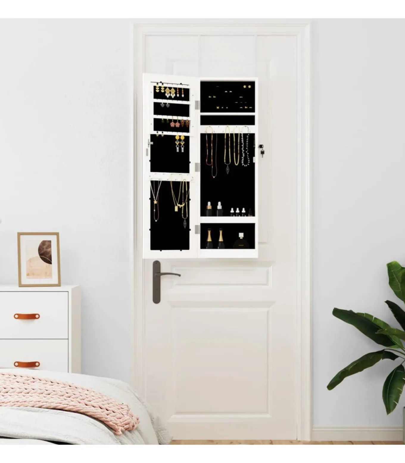 Voldoende opbergruimte: de spiegel met opbergruimte heeft veel haakjes, hangers en plankjes om je sieraden netjes geordend en binnen handbereik te houden.