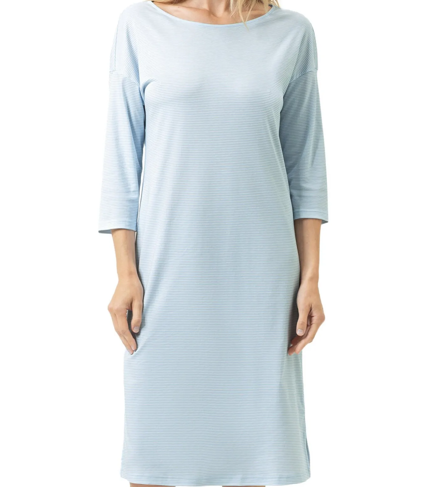 Het nachthemd uit de serie Simple Stripes combineert tijdloze elegantie met puur comfort. Het is gemaakt van 100% zacht katoen, voelt aangenaam aan tegen de huid en zorgt voor een natuurlijke slaapomgeving. Het licht gestreepte ontwerp geeft het nachthemd een frisse look. Met 3/4–mouwen en een lengte van 100 cm biedt het een comfortabele pasvorm en ideale bewegingsvrijheid – perfect voor rustgevende nachten en ontspannende uren thuis.