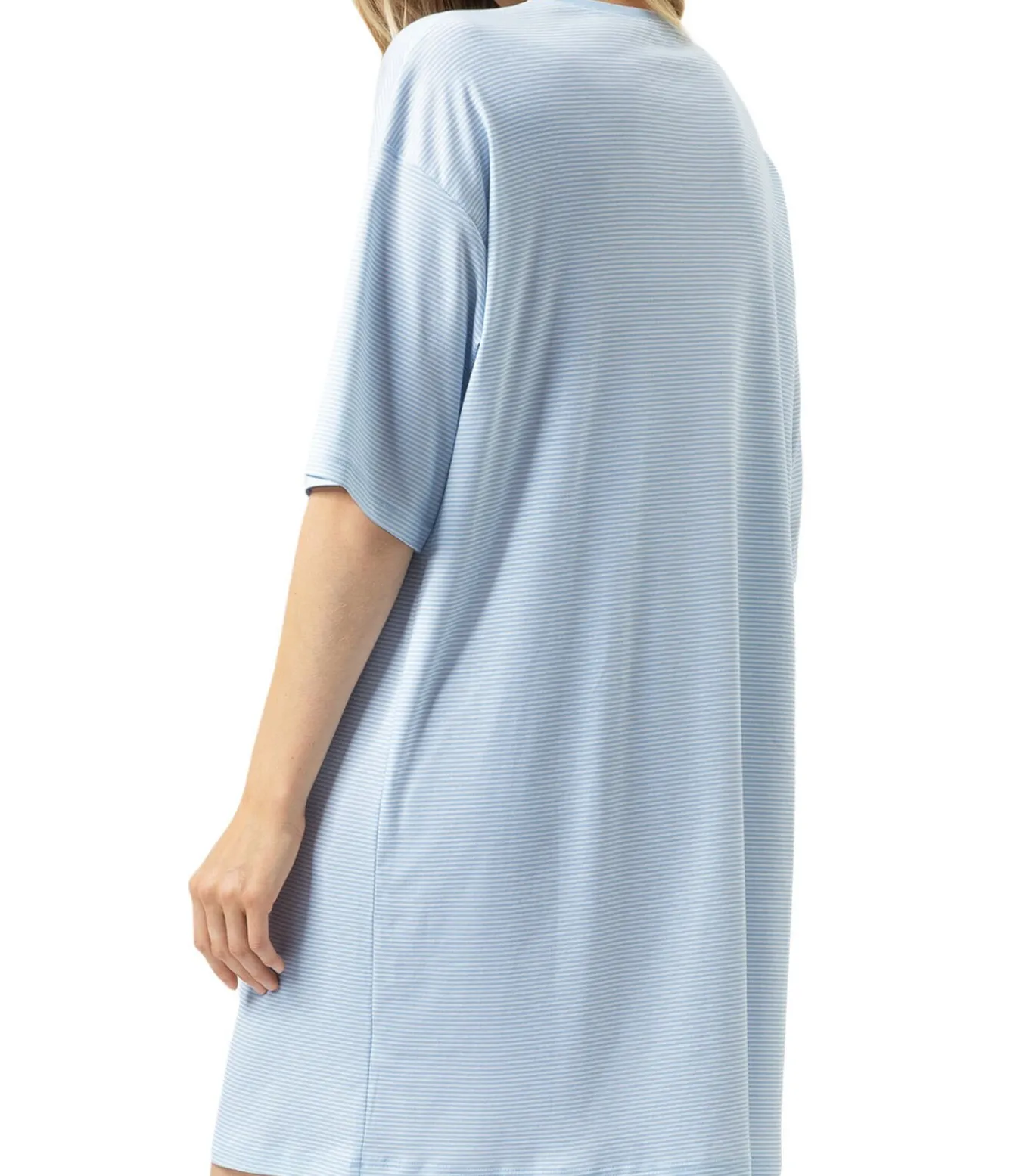 Het nachthemd uit de serie Simple Stripes combineert een tijdloos ontwerp met natuurlijk comfort. Het is gemaakt van 100% zacht katoen, voelt aangenaam licht aan op de huid en zorgt voor een goede nachtrust. De contrasterende ronde hals en korte mouwen benadrukken de moderne look. Met een lengte van 88 cm biedt het nachthemd een comfortabele pasvorm – ideaal voor ontspannen nachten en gezellige uurtjes thuis.