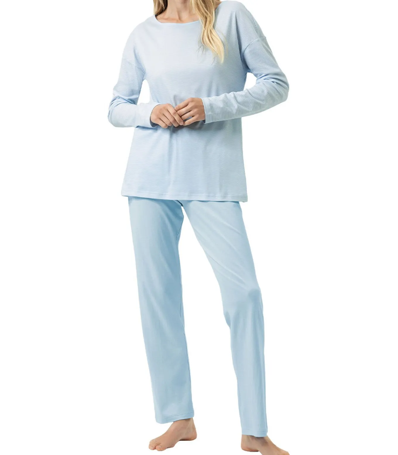 De pyjama’s uit de serie Simple Stripes combineren tijdloos design met een hoog draagcomfort. De top met lange mouwen in een licht streepdessin zorgt voor een moderne look, terwijl de lange, effen broek met elastische tailleband maximale bewegingsvrijheid en comfort biedt. De pyjama is gemaakt van 100% zacht katoen, voelt aangenaam aan op de huid en is ideaal voor rustgevende nachten en ontspannende uren thuis.