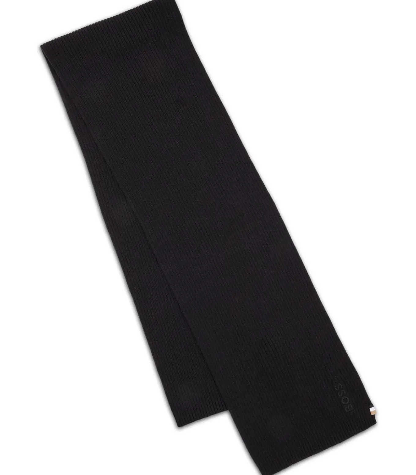 Klassieke gebreide sjaal voor heren van BOSS. Aangenaam warme ribbelsteek van katoen met wol. Kenmerkend streepjeslabel en geborduurd logo. One size.