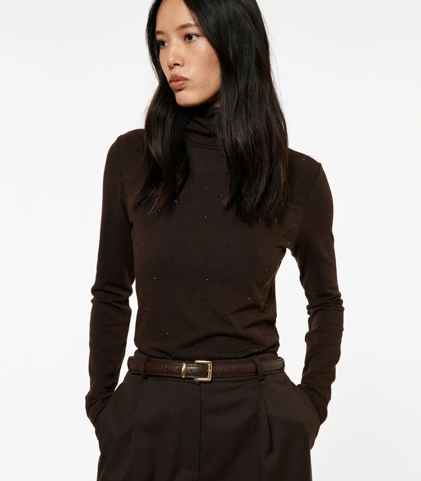 Ontdek deze elegante coltrui met een slanke pasvorm en lange mouwen, perfect voor koelere dagen. De subtiele kralen op de voorkant geven een verfijnde uitstraling, waardoor het een veelzijdige keuze is voor zowel casual als formele gelegenheden. Combineer het met een rok of broek voor een stijlvolle look.