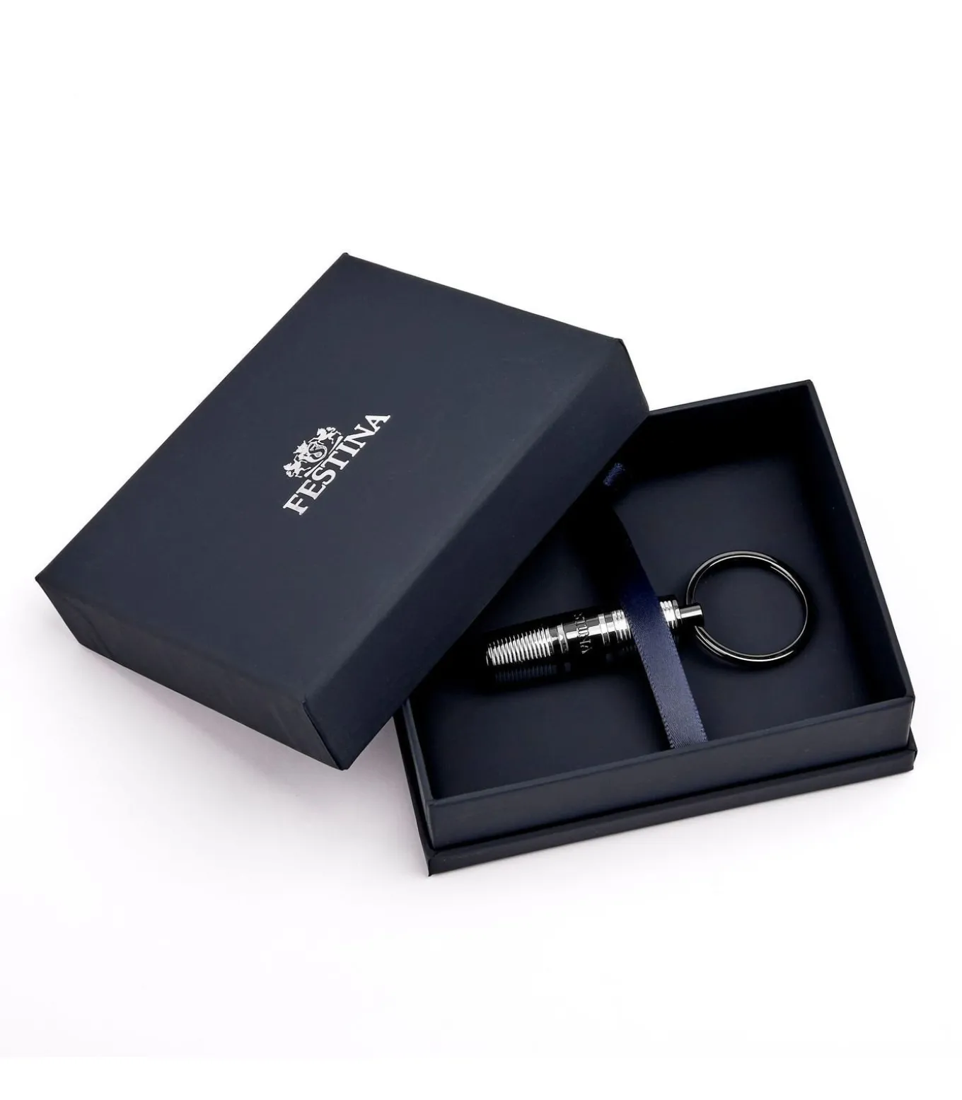 Maak kennis met de Festina Bold sleutelhanger, een verfijnd accessoire voor elke dag. De gestreepte, gegraveerde metalen behuizing, versierd met ingewikkelde blazoenen details op de punt, weerspiegelt nauwgezet vakmanschap en tijdloos design. Het Festina logo is elegant gegraveerd op de middelste ring, terwijl het blazoen op de punt staat. Kies uit de verfijnde Chrome & Gun, de gedurfde geheel zwarte met Gun details, of de chique Gun & Rosegold opties, passend bij de gelijknamige pennen. Dimensions: DIA.13 x 50/RING:30 mm, Material: 98% Brass,2% Stainless steel