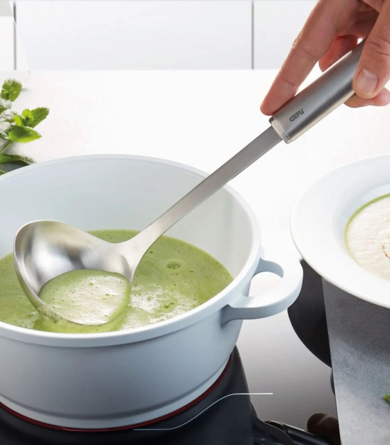 De Gefu Soeplepel Primeline is geschikt voor het portioneren van muffins, wafels of pannenkoekbeslag maar ook van soepen en sauzen. De inhoud van de soeplepel Primeline is 100 ml en is gemaakt van roestvrij staal. De soeplepel heeft een lengte van 33.5 cm. Schep snel en gemakkelijk op met de Gefu Pollepel Primeline!