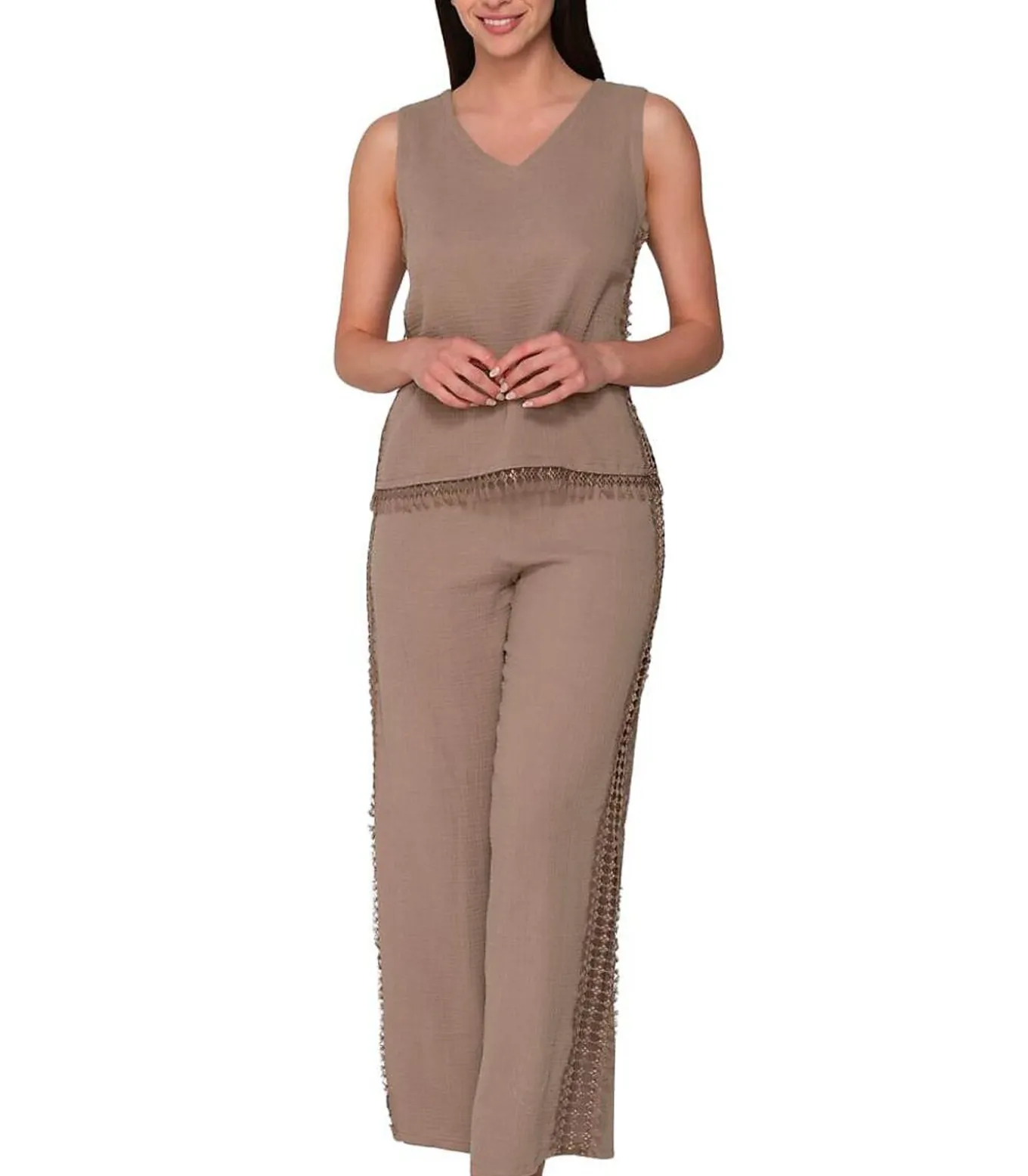 Broek gemaakt van een lichtgewicht katoenen stof met reliëfstructuur. De rechte, vloeiende snit is ideaal voor optimaal comfort. De zijkanten zijn versierd met delicate macramédetails die een vleugje verfijning en vrouwelijkheid aan het ensemble toevoegen. De stijl is zowel casual als chic, perfect voor zomerse dagen.[Broek wordt apart verkocht. De top, sieraden en andere accessoires die het model op de foto’s draagt, zijn niet inbegrepen].