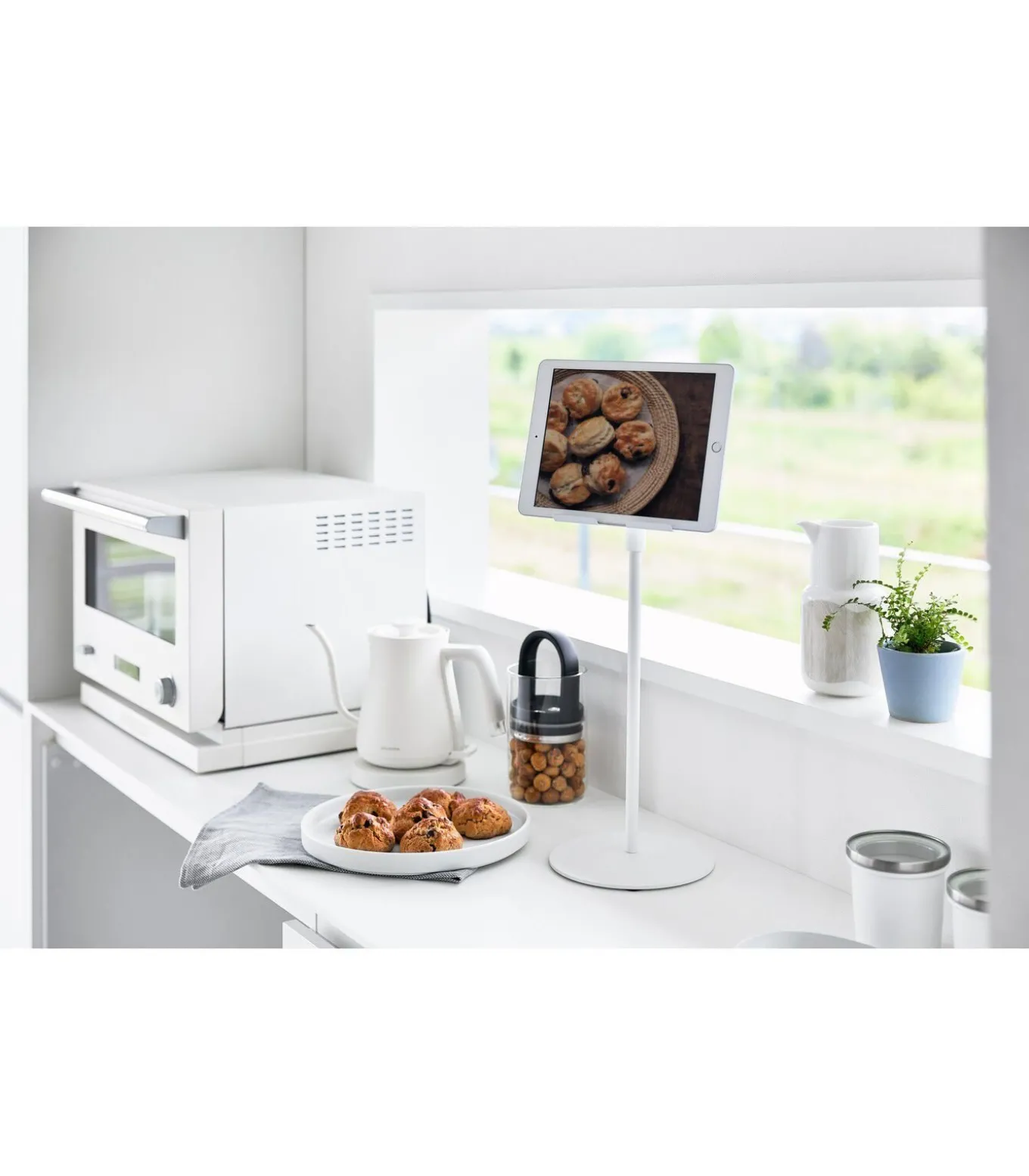 Deze standaard van Yamazaki kan worden gebruikt om handsfree te gamen, werken of videokijken. Door de verstelbare hoogte kan de houder zowel op de vloer als op een tafel worden geplaatst. Aan de onderzijde zit een opening wat het mogelijk maakt om de tablet of gamecontroller op te laden terwijl deze in de houder staat.