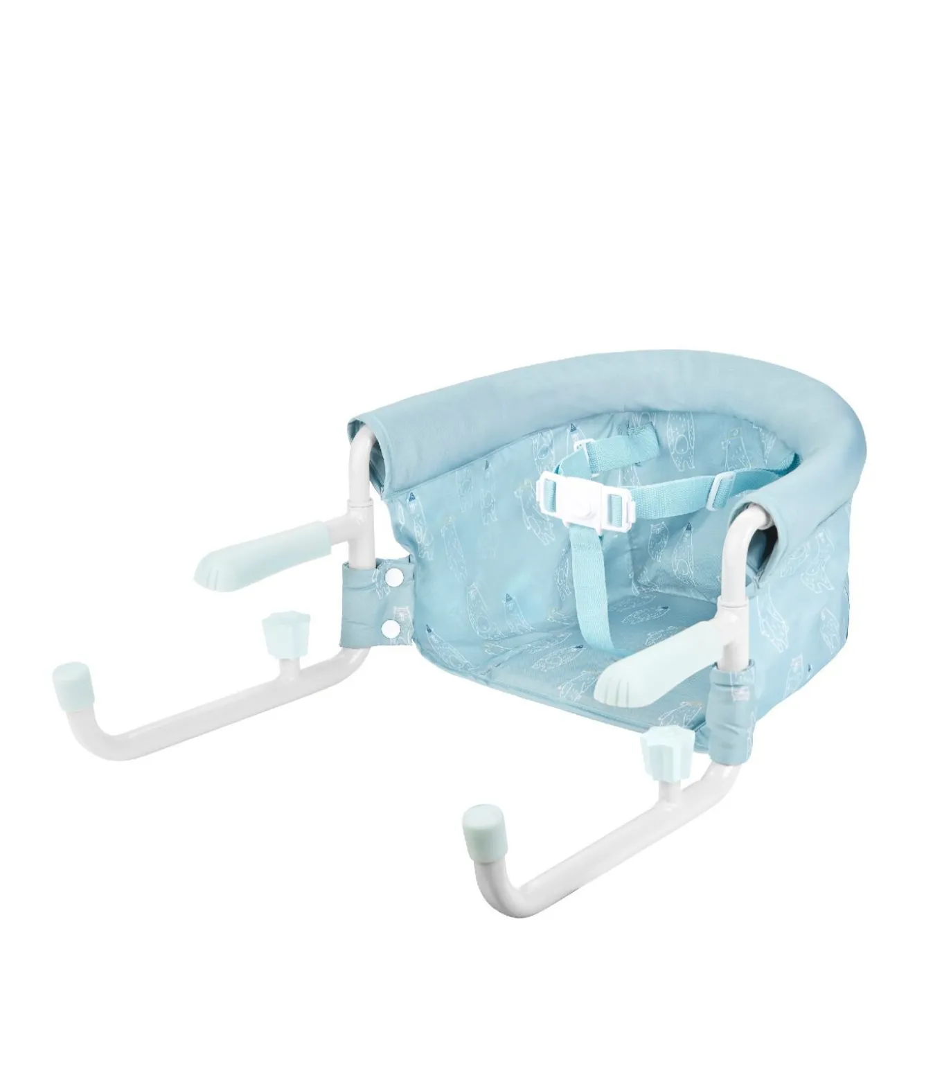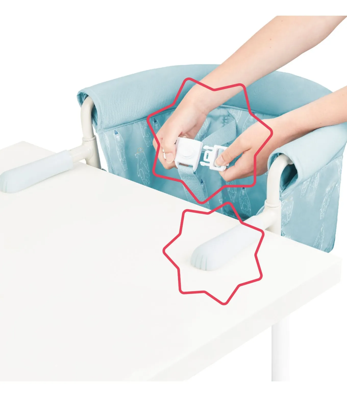 Uiterst stabiel bevestigingssysteem met 4 armen, aanpasbaar aan tafels van 20 mm tot 53 mm dik Ultracompact en licht, eenvoudig op te vouwen 3–punts veiligheidsgordel In hoogte verstelbaar: 3 standen Opbergvak op de rugleuning Machinewasbaar (30°)