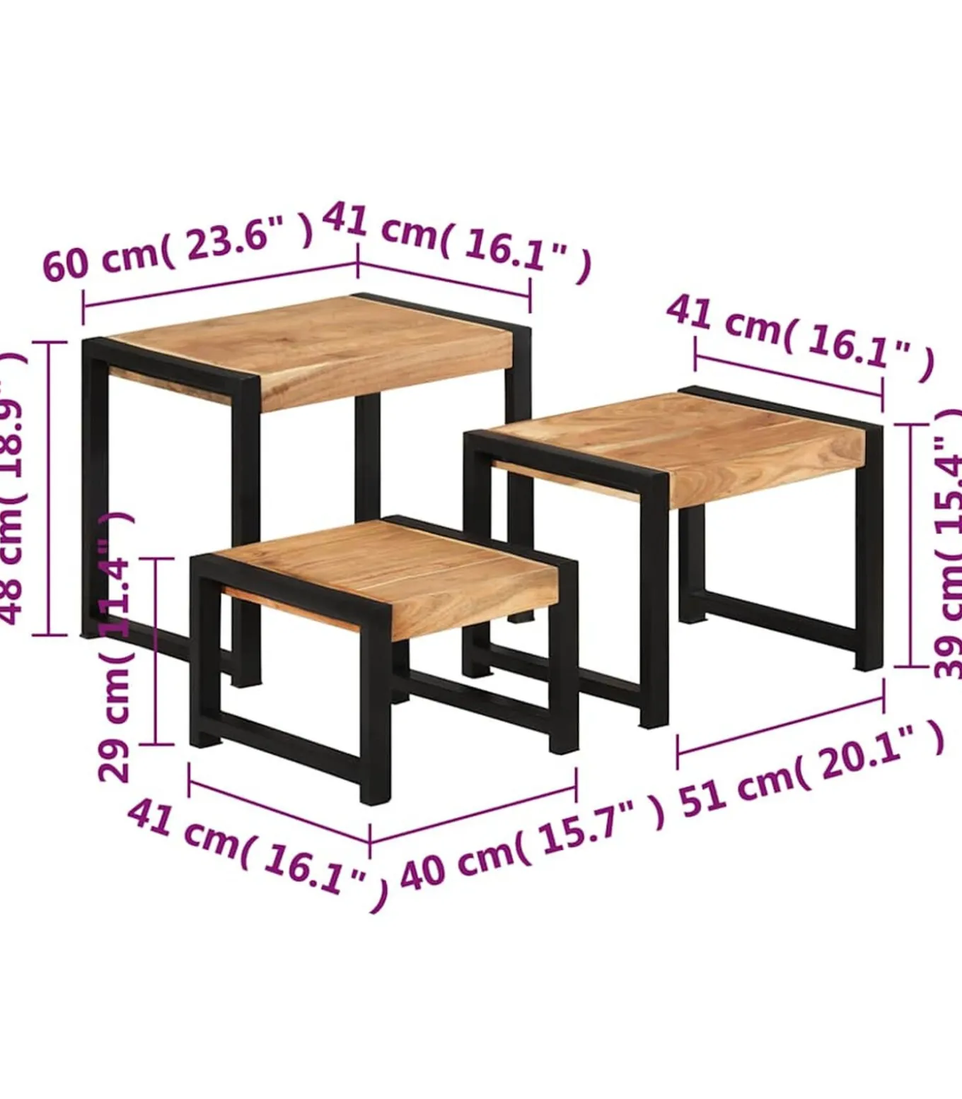 Deze set van 3 tafels in vintage stijl is van massief acaciahout en rubberwood gemaakt. Deze tafels zijn een tijdloze toevoeging aan je huis. De tafels zijn met hun sterke stalen frame zeer stabiel en duurzaam. Doordat ze stapelbaar zijn, nemen de tafeltjes weinig ruimte in beslag wanneer ze niet in gebruik zijn. Het vakmanschap voegt een spectaculaire retrostijl toe aan deze tafels. Elke stap van het proces is met uiterste zorg uitgevoerd, of het nu om het polijsten, verven of lakken gaat.